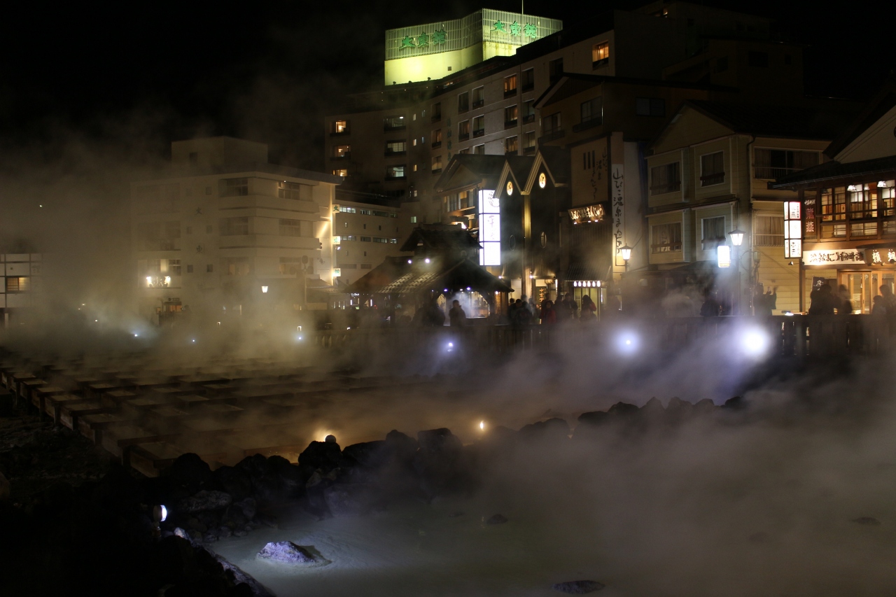 草津温泉の中心にあり、湯けむりがもうもうと立ちあがっており、いかにも温泉地っぽくていい感じでした。夜行きましたが、浴衣姿のお客さんで大変賑わっており、温泉地のさびれた感じはなかったです。音楽イベントや近くの神社のライトアップなど、お客さんを楽しませることにも頑張っている感じでした。
