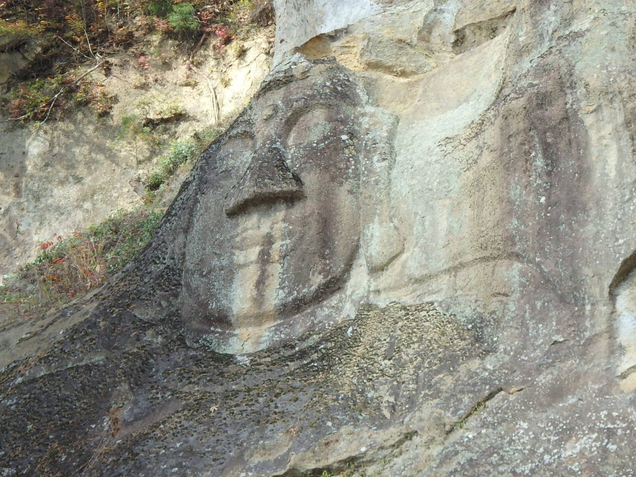 達谷窟毘沙門堂の横の岩壁に彫られた磨崖仏です。日本で最も北の磨崖仏で、地上から30メートルの高さに彫られているとのこと。源義家が馬上から弓筈で彫ったという言い伝えがあるようです。