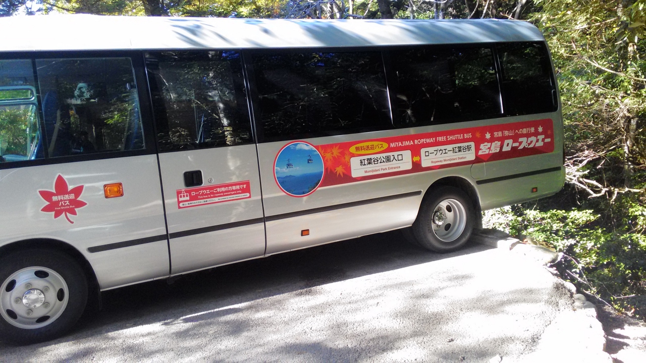 宮島の紅葉谷公園の入り口からロープウェイの紅葉谷駅までを往復しています。乗車時間は3分程度ですが、なだらかな登り坂がつづくので足の不自由な方や高齢者の方には便利ではないかと思います。9時から17時頃まで20分間隔で運行されています。