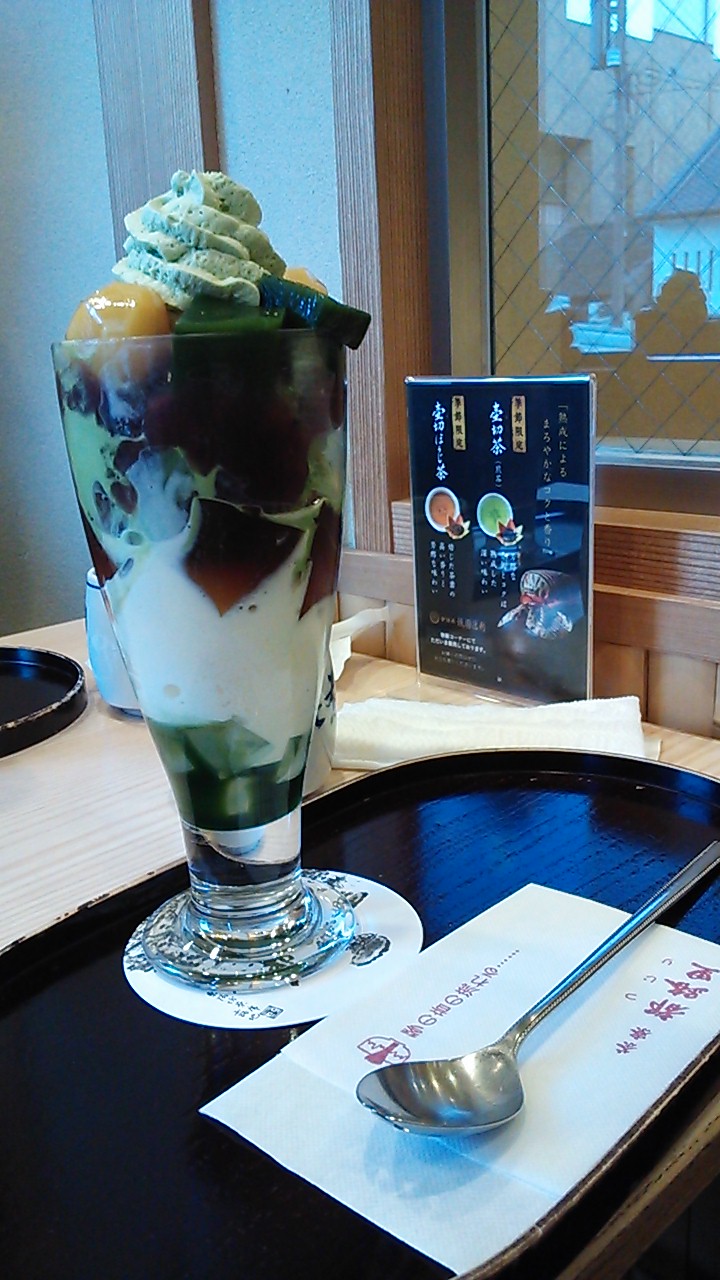 祝日の午後2時半過ぎに店に到着。午後は空いているのでは・・と思ってましたが、行列に並ぶこと約30分。途中、店員さんから小さなカイロのサービスがあり、暖まれて嬉しかったです。2階と3階にある茶房へは、階段でした。普通サイズのパフェを注文、白玉、あん、寒天、クリーム、栗の甘煮等、多種類が一度に楽しめ大満足、抹茶味最高でした。量は多めで残念ながら完食できませんでした。