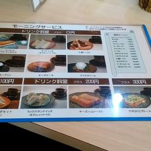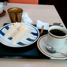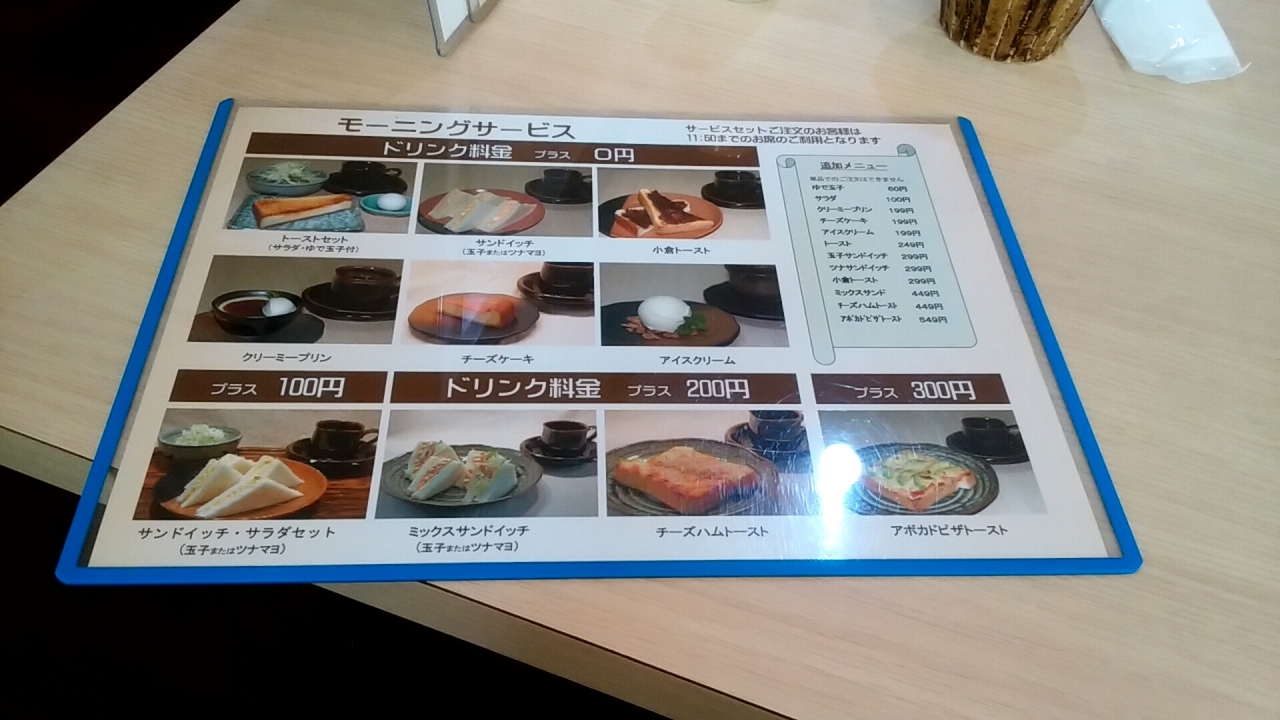 モーニングサービスはトースト、サンドイッチ、小倉トースト、のパンの他にプリン・チーズケーキ・アイス、のデザートがありました。