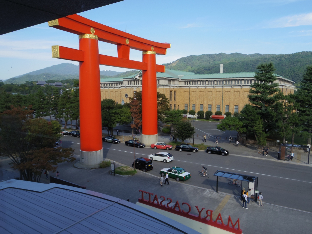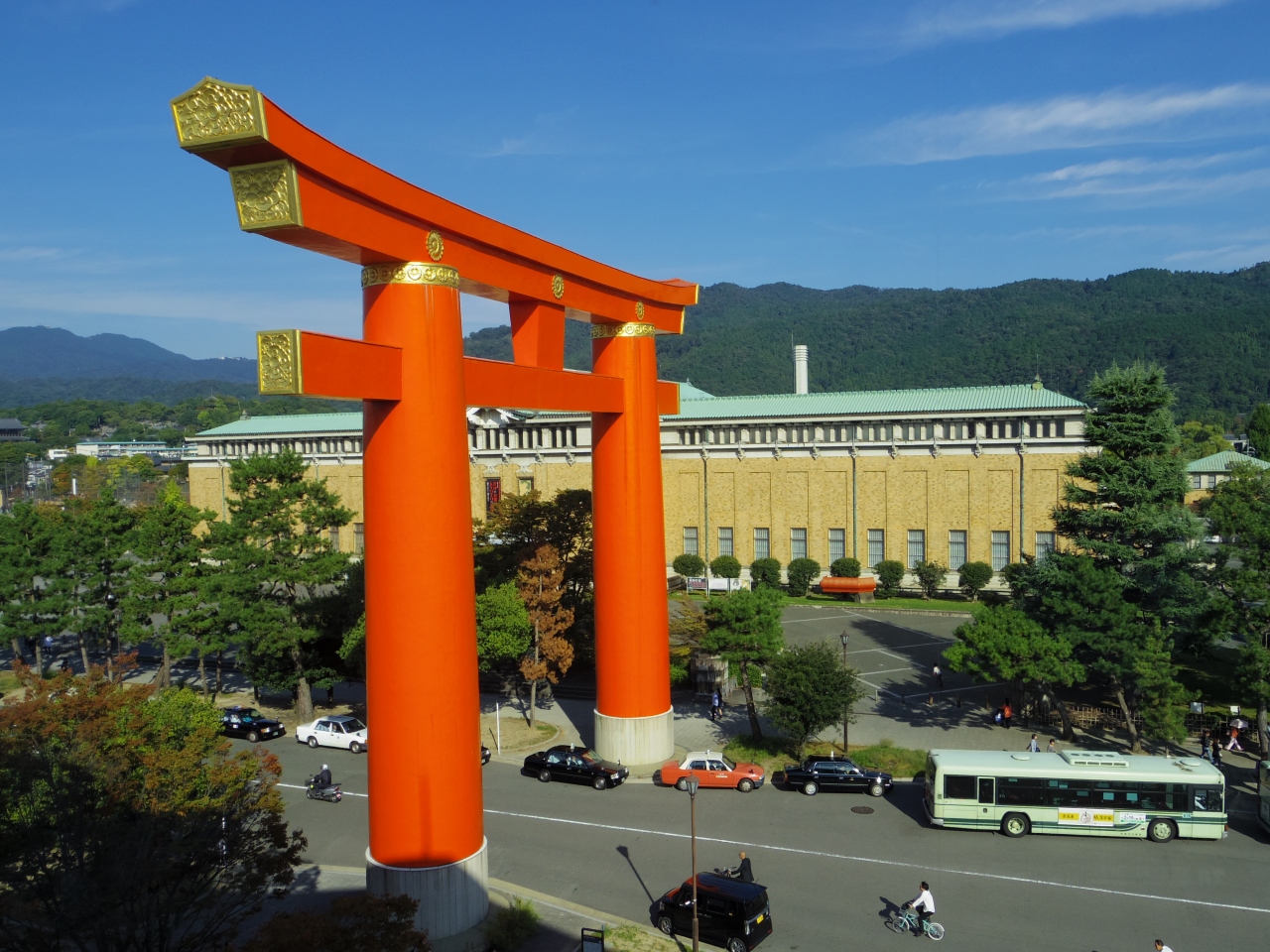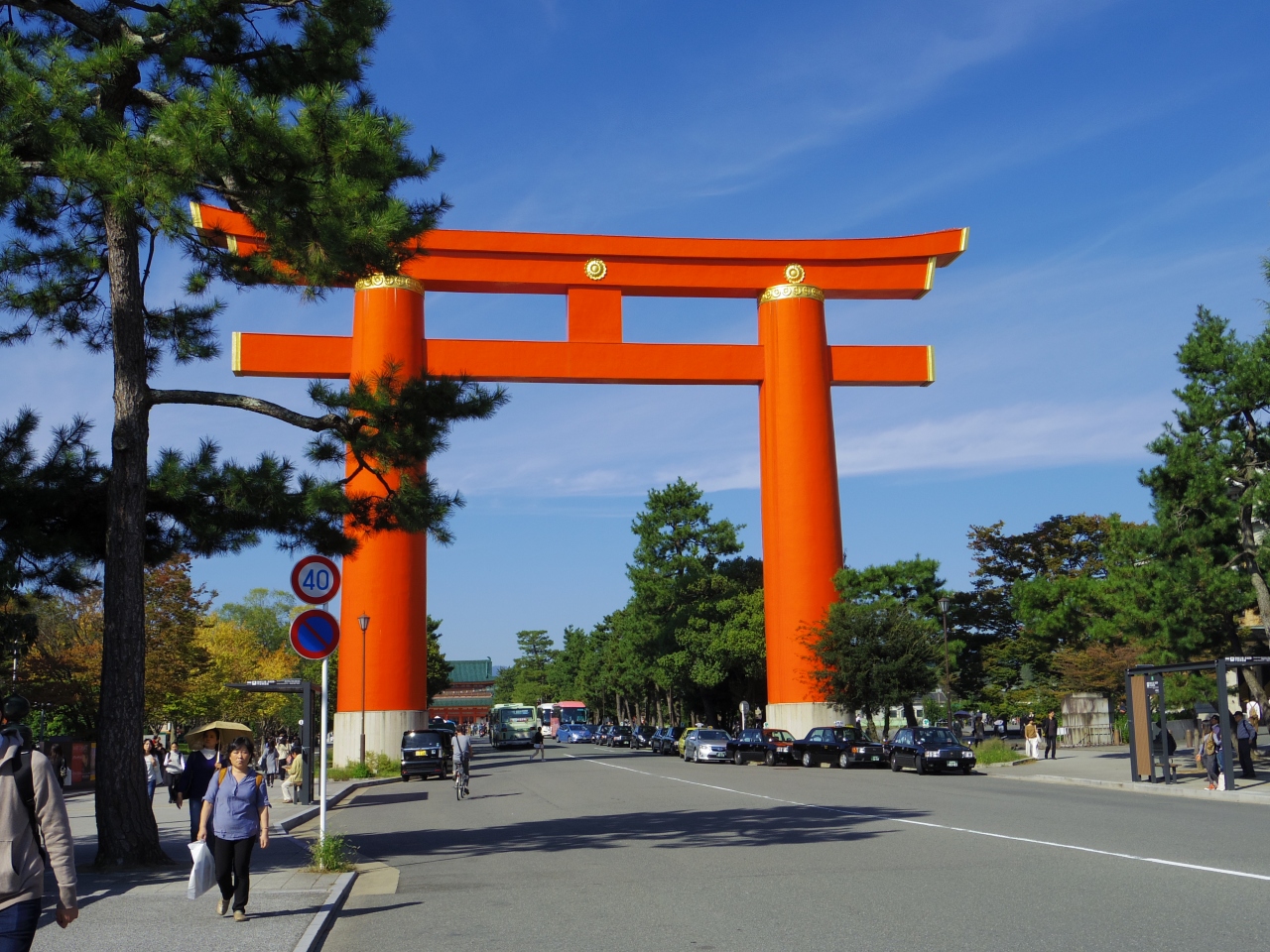 平安神宮の正門、応天門から300mほど南にある大鳥居で、高さ24m、幅18m、鳥居の下が道路になっているため、クルマが通り抜け、両脇の歩道も人通りが多く、にぎやかな感じがしました。