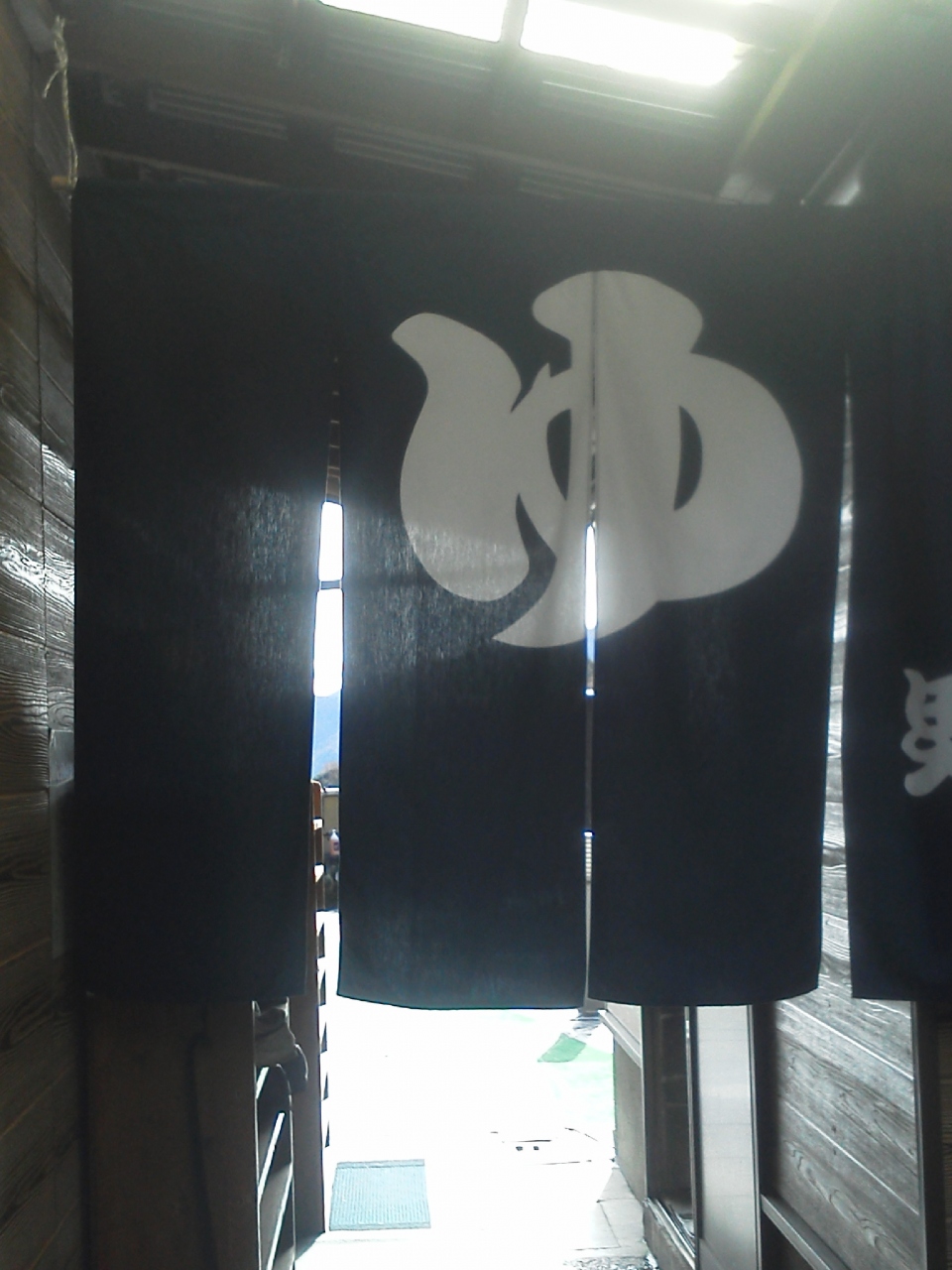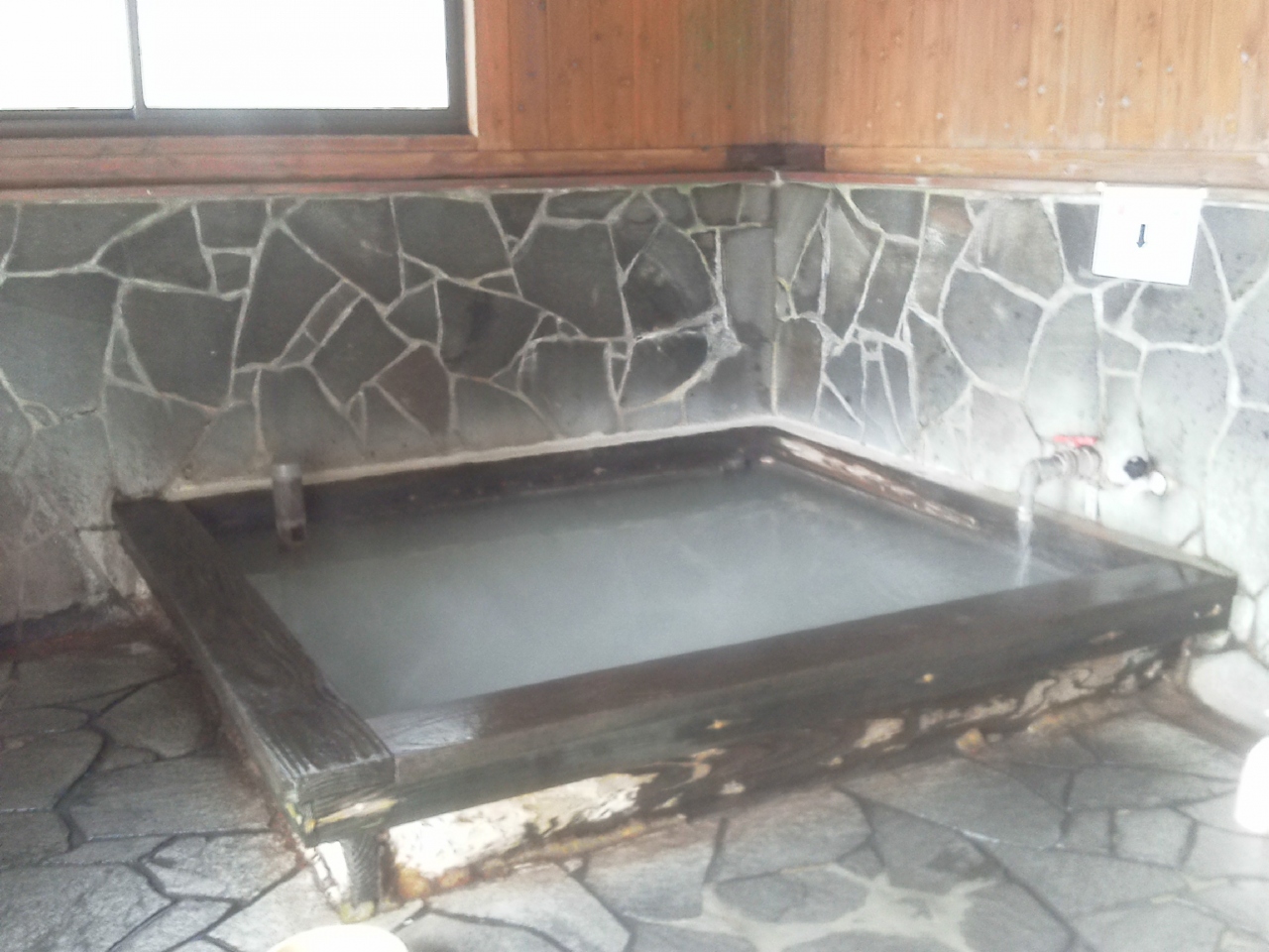 入浴券(600円)を買って、男用のぼりを開けると(普通は脱衣場)露天風呂が、素裸の男性が二人も(*_*) 露天風呂は大きな広さで硫黄泉(温まります)ですが、そりより魅力は眺望です…小高い山に`アーチ橋`が掛かって遠くには`別府湾`が!