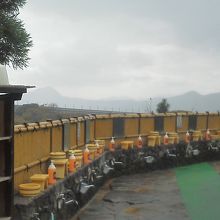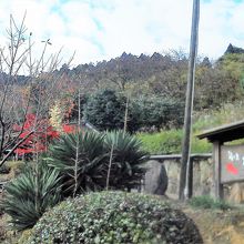 サファリ(or 立命館)行き のバス45分地蔵湯前(明礬の次)で降りて上り坂を7分歩いて`湯の花小屋/土産店`で、中庭を5分で着きました。