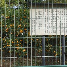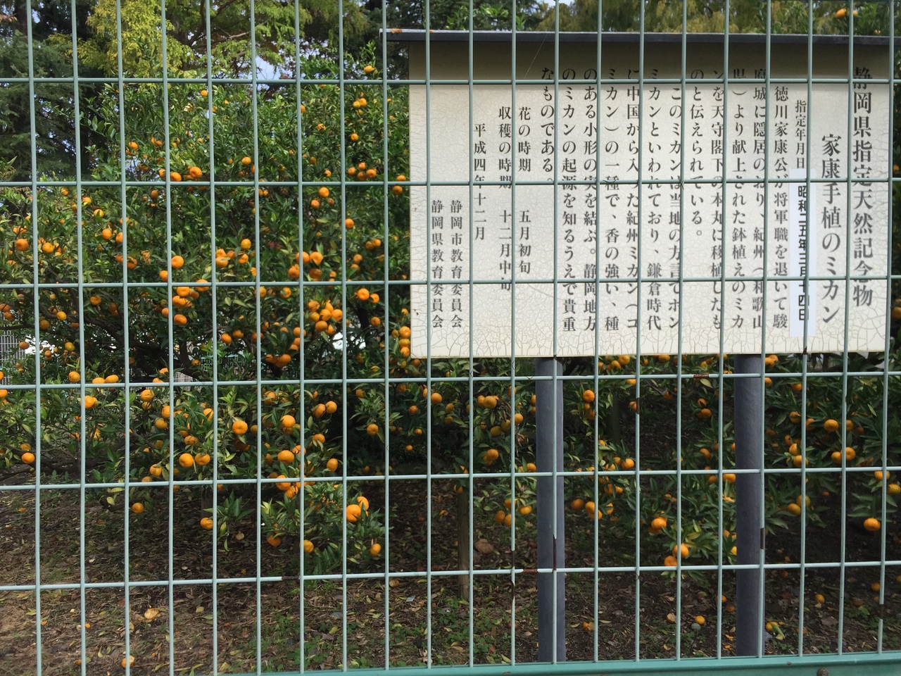 駿府城公園のほぼ中央付近、元天守閣跡のあたりにあります。隣に家康公の像があるので、分かりやすいです。ネットフェンスに守られたみかんの木なので、近くに寄ってみると、家康公がお手植えしたみかんだということがわかりました。ちょうどいい時期なのか、たわわになっていました。どなたかが収穫して食べるのでしょうか?