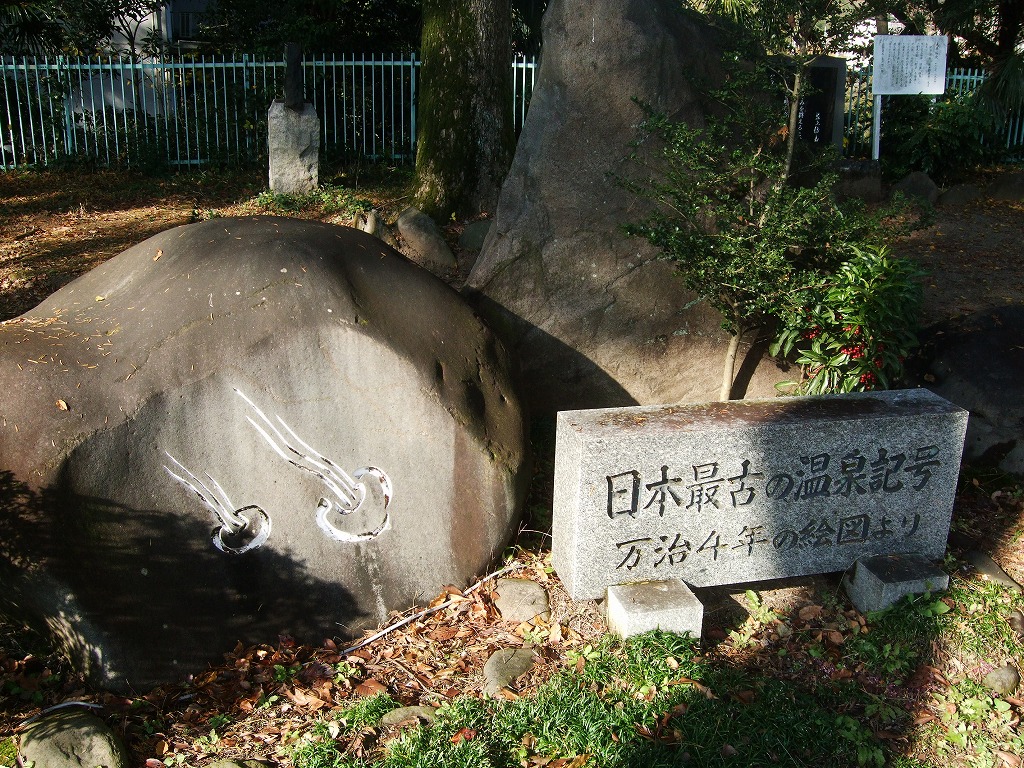 神社の裏庭に、”日本最古の温泉記号”の石碑があります。今から350年前にすでに使われていたというのが驚きです。