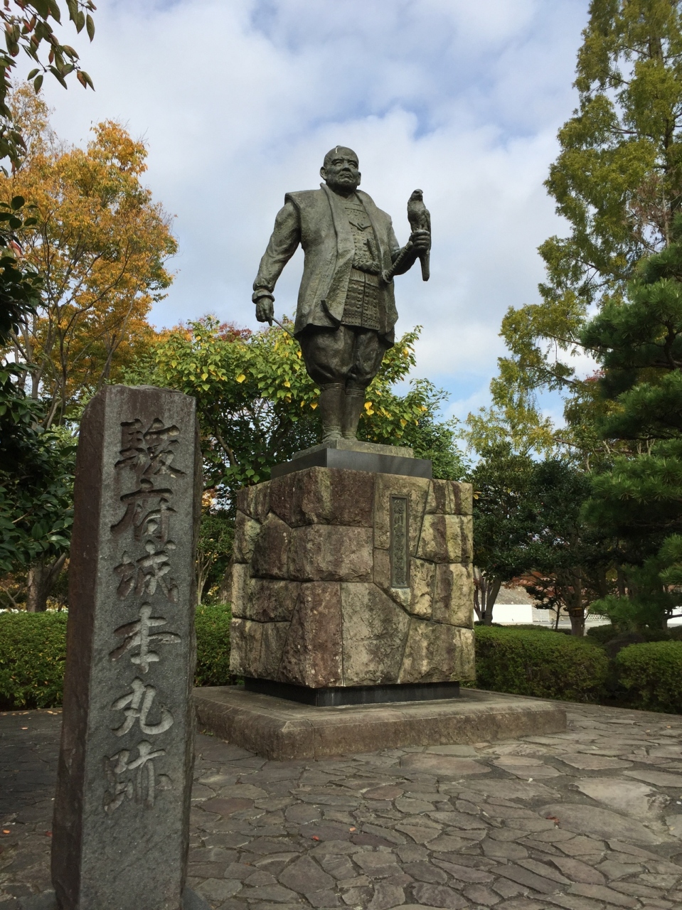 駿府城公園のほぼ真ん中のあたりで、本丸跡との石像がある近くに堂々と建っています。晩年の鷹狩りの姿ということで、静岡駅前にある壮年期の戦の最中の姿とは佇まいが違います。