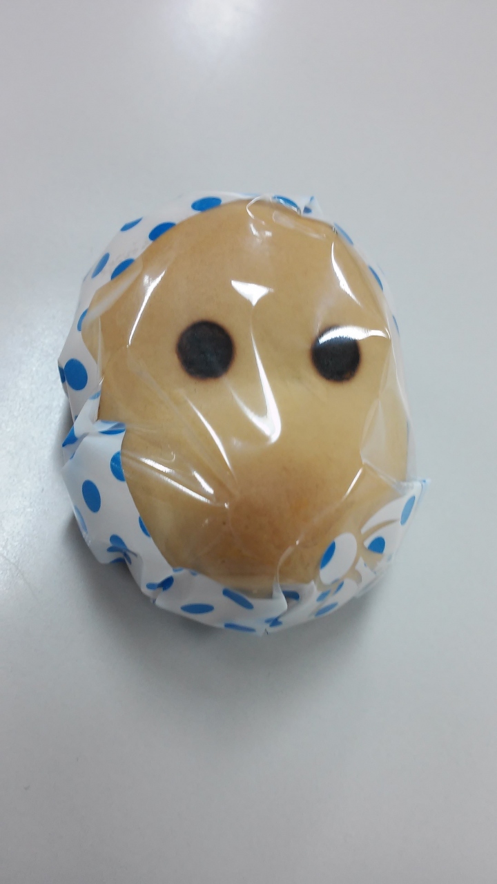 実際は頭にかぶる手ぬぐい部分は、お菓子の包装部分である。お菓子部分は目に代わるものがあるだけ。不思議!遠くからみるとホントひょっとこ面に見える。