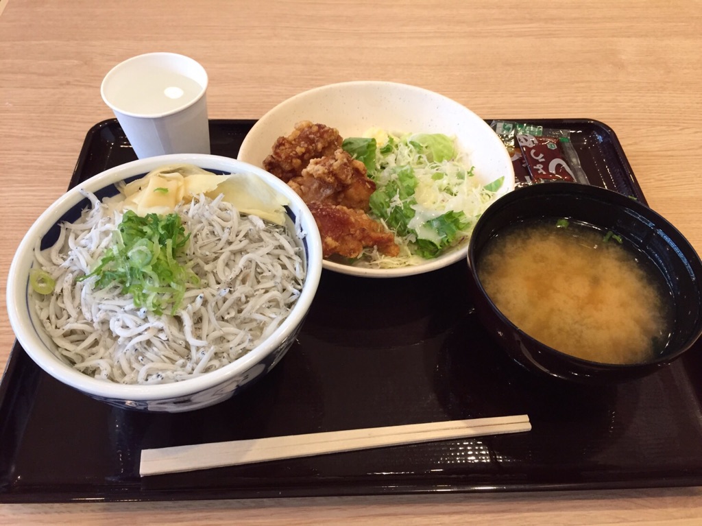 シラス丼はたくさんシラスがのっています。しらすはスッと溶けるくらいふわふわしたかんじが良かったです。生姜と醤油もあるのでお好みでどうぞ。みそ汁と鶏のからあげも付いてくるので結構ボリューム満点な定食でした。