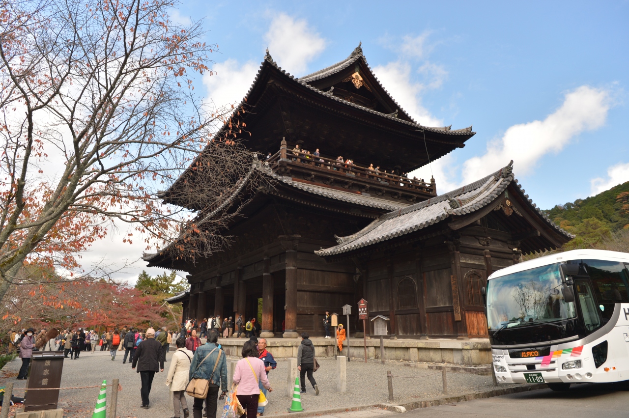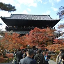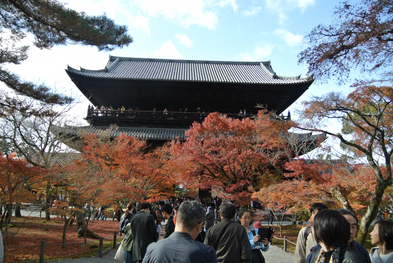 南禅寺というと、この山門と水路閣を思い出します。南禅寺の伽藍の中でも一番有名な建物ではないでしょうか。堂々とした大迫力の建物です。反った屋根の形も美しく、日本三大門のひとつというのも納得です。今回は紅葉時期ということもあって、紅葉と一緒の写真を撮ることができました。