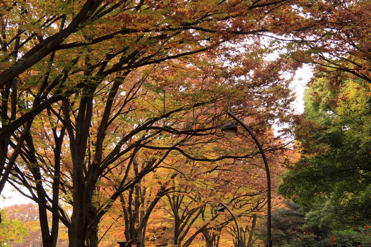 駒沢通り沿いのイチョウ並木や西口出入り口付近のケヤキ並木もいい感じで色付いていました。公園内の楓は鮮やかに色付いて、所によっては落ち葉がアクセントになっていました。