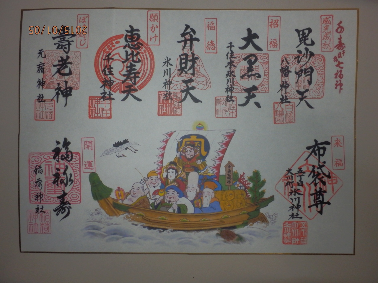 北千住駅出発、某出版社の案内書に従い歩くが目的神社に着いても七福神は無い。実はこの案内書は古いのか間違いだらけ。人に道を確認しながら進み、30分かかって大川町氷川神社(布袋尊)に到着した。布袋尊は実在した中国の高僧で、家庭円満の神様です。都会の真ん中にしては割と広い境内に浅間神社、富士塚(富士山)、石像の布袋尊、紙漉きの碑がありました。参拝者は我々のみ、ゆっくり参拝できました。御朱印を頂きました。