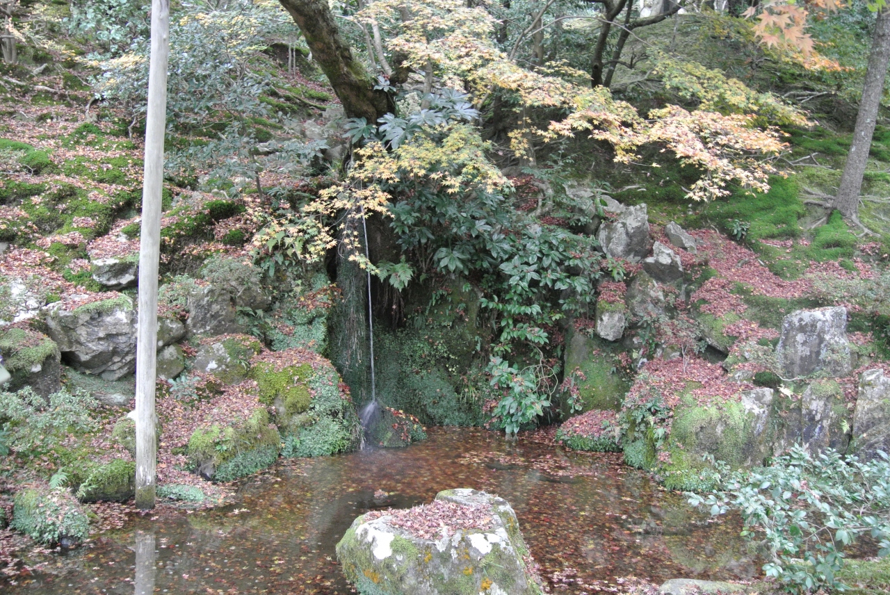 銀閣寺の庭園の山手の方にあります。順路に従って山を上って行くと自然と洗月泉の前に出るようになっていました。小さな滝が流れ込む泉ですが、湧水を集めたとてもきれいな水でした。この滝水が銀閣寺の庭園へと流れているということです。