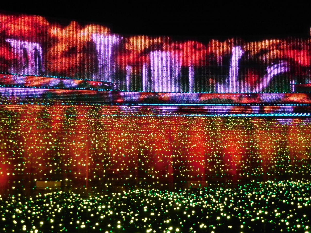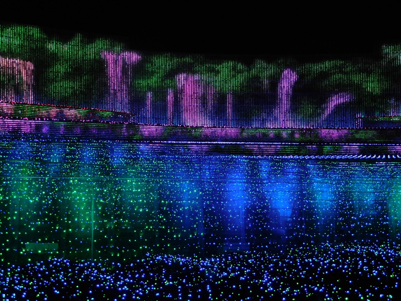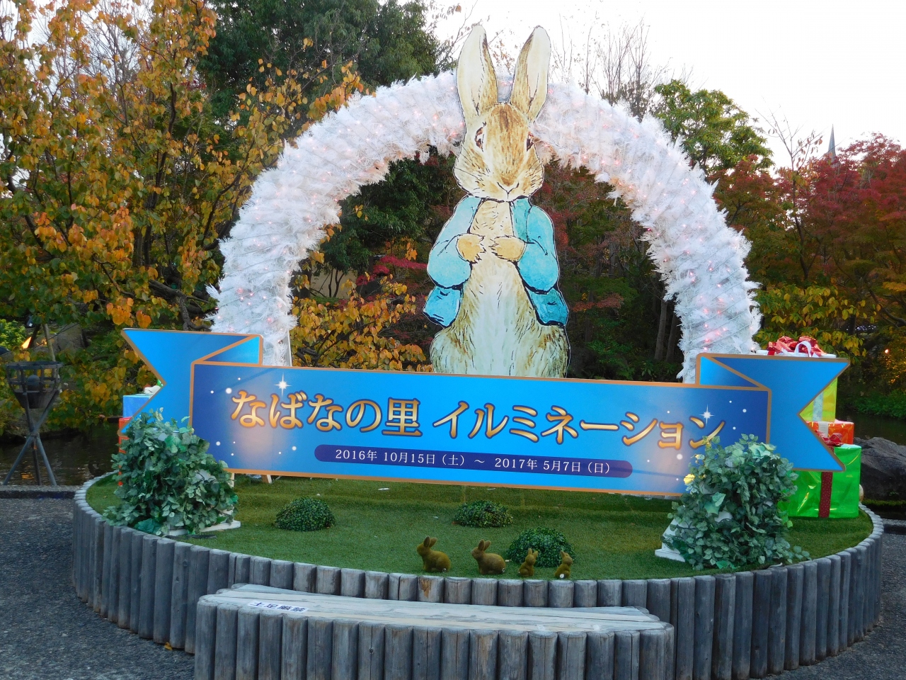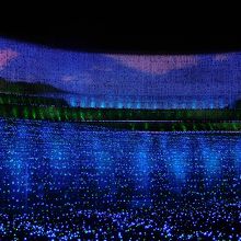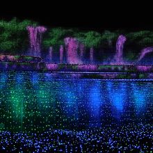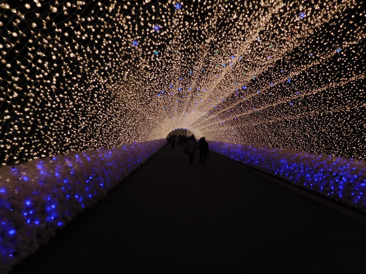 200メートルまっすぐに続く光のトンネルを抜けると、メイン会場の大きなパノラマのイルミネーションが広がっていました。2016年のテーマは「大地」で、約6分25秒で景色が一周するようになっていました。帰りのトンネルは、少し曲がりくねった形をしていて、秋をイメージし、3色に色が変化していました。鏡池の近くでは紅葉も楽しめました。平日に行ったので、割とゆっくり見る事が出来て良かったです。