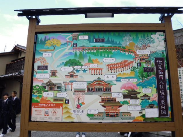 伏見稲荷神社の門からまだ歩くとそこに現れるのがこの本殿です。両側に大きくて立派なキツネさまで赤の建物が鮮やかです。