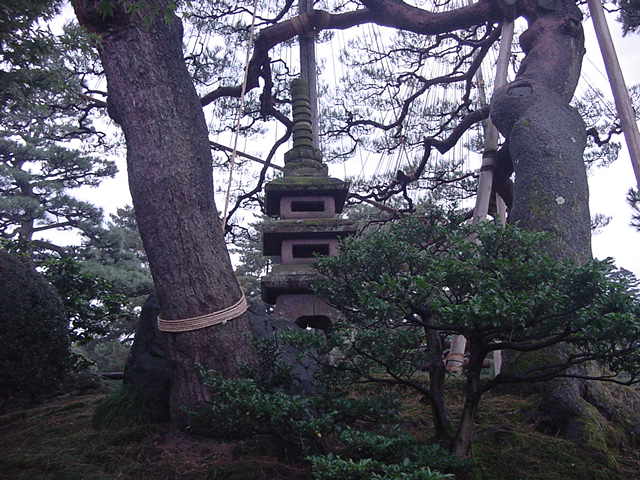美しい日本庭園を堪能することができる兼六園。その園内にある遺構や石碑の一つです。霞ヶ池から西に行くと、少しこんもりした山が七福神山ですが、その中に毘沙門塔があります。入口の中では上坂口がもっとも近くなっています。