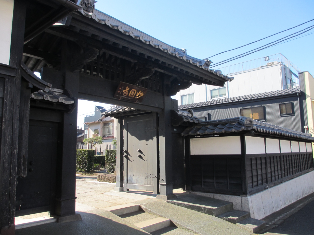 三崎坂沿いに建つ、門が黒塗りの寺です。門をくぐった参道の先には、道後温泉の建物を連想させる風格ある本堂が構えています。本堂は高台に建っているため、墓地全体を見渡すことができます。隣に建つ妙法寺とは、垣根でなんとなく区切られているため、妙円寺から入ったはずが、いつの間にか妙法寺にいたなんてことにもなりかねません。どちらの寺も趣が感じられる寺です。