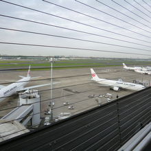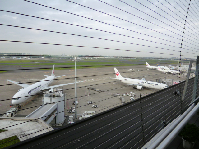 羽田空港に予定より早く到着したので、保安検査場へ向かう前にビル屋上にある展望台に行きました。この日利用したのはJALの発着する第一ターミナルでしたので、フェンス越しに何機も鶴丸の機体が並ぶさまは壮観でした。