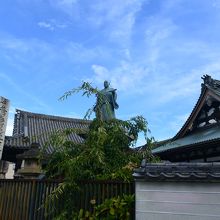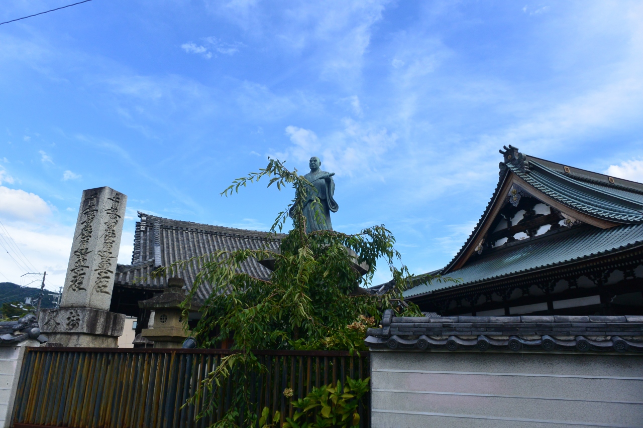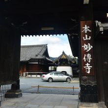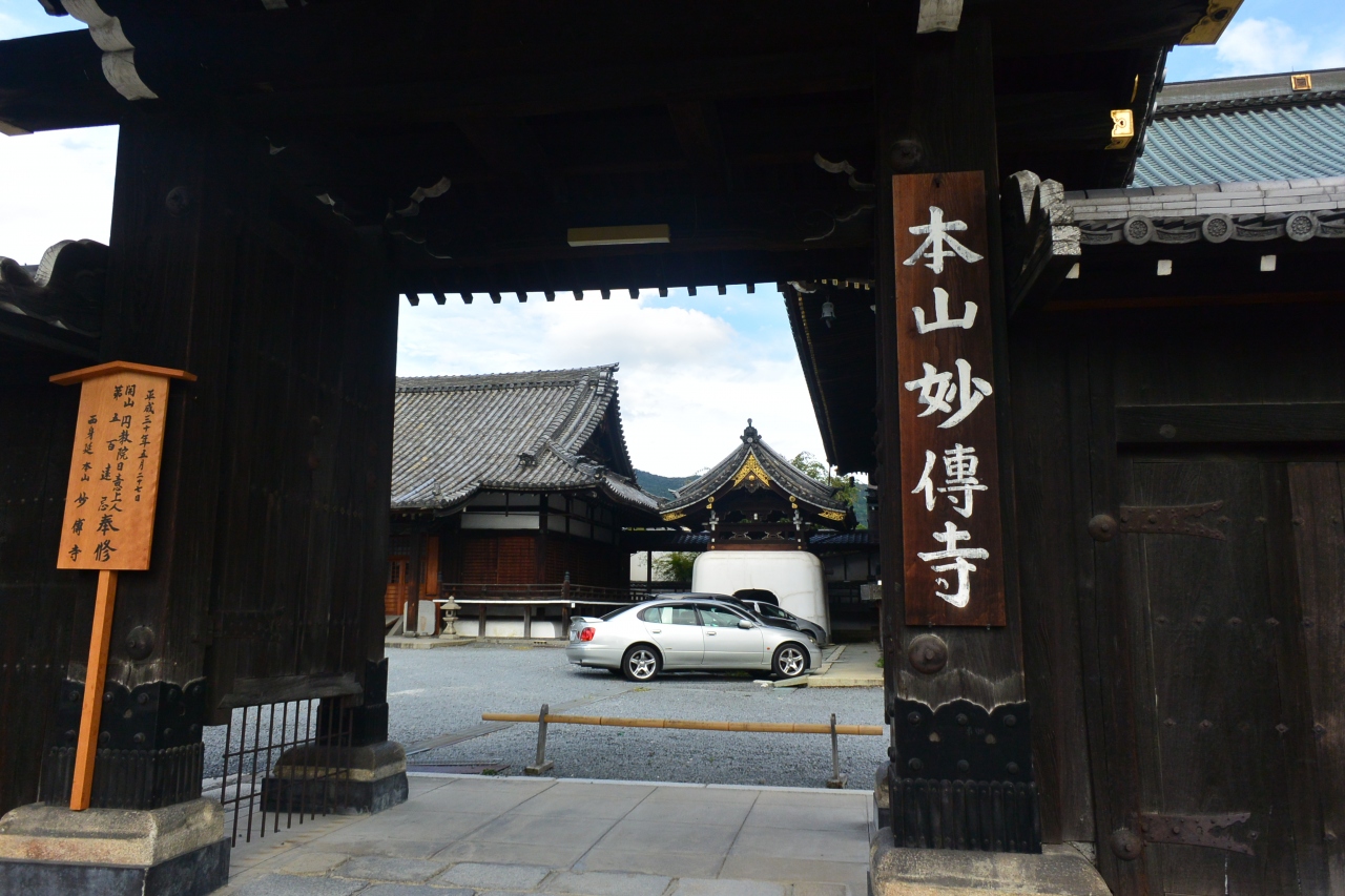 岡崎公園の西側、東大路通りに面して建つ日蓮宗のお寺です。門は開いていて自由にお参りができました。お寺の境内の交差点に面した角のところに、道路に向かって建てられている日蓮上人の銅像がとても印象的でした。