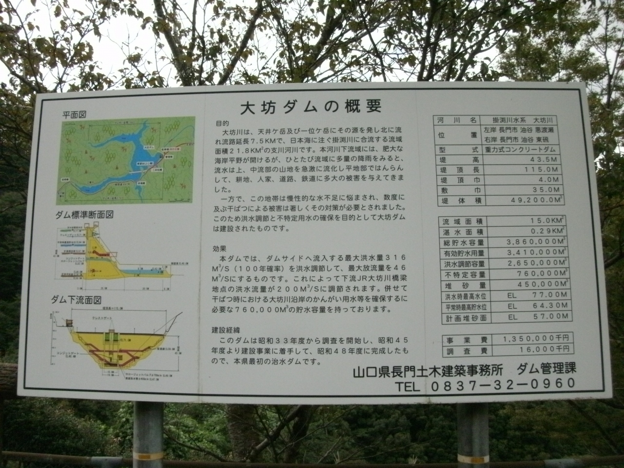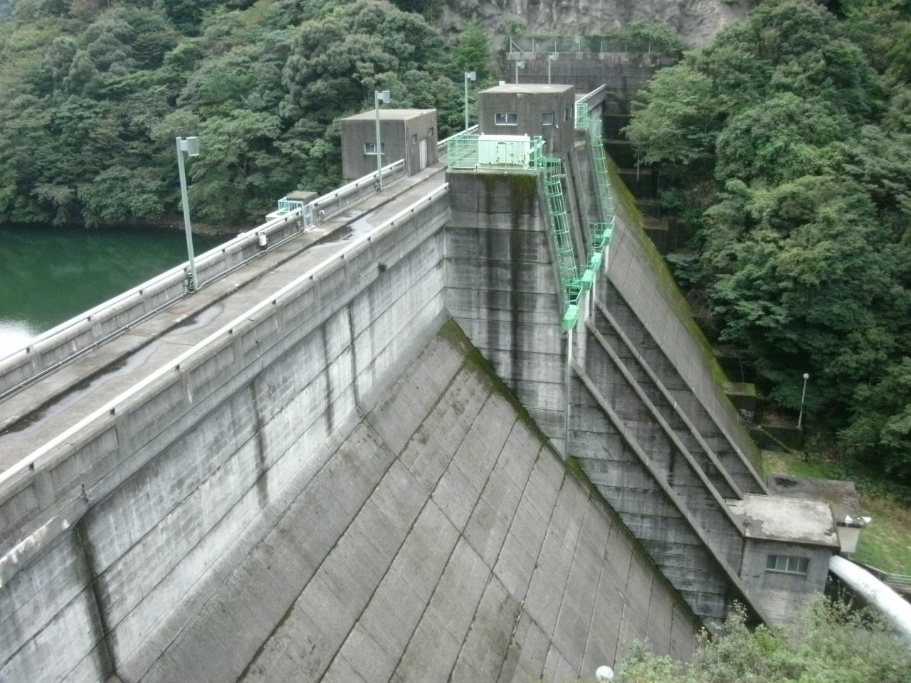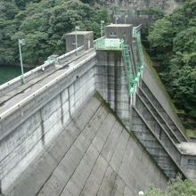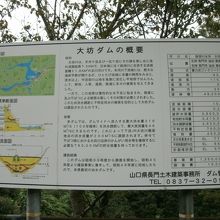 ダムサイト右岸に管理所があり、その近くにダムの説明板(添付写真)が掲示されています。ダム堤体上は車進入禁止になっていましたが、歩いてなら入ることができるので堤上から下流側を覗くとバルブから放流している様子が良く見えました。