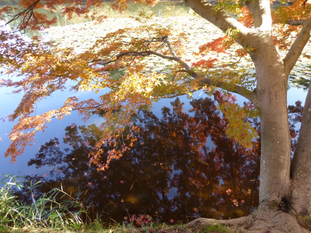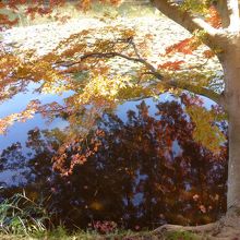 もみじの木の枝々が池に伸び、澄んだ水面に映る色付いた葉も素晴らしかったです。