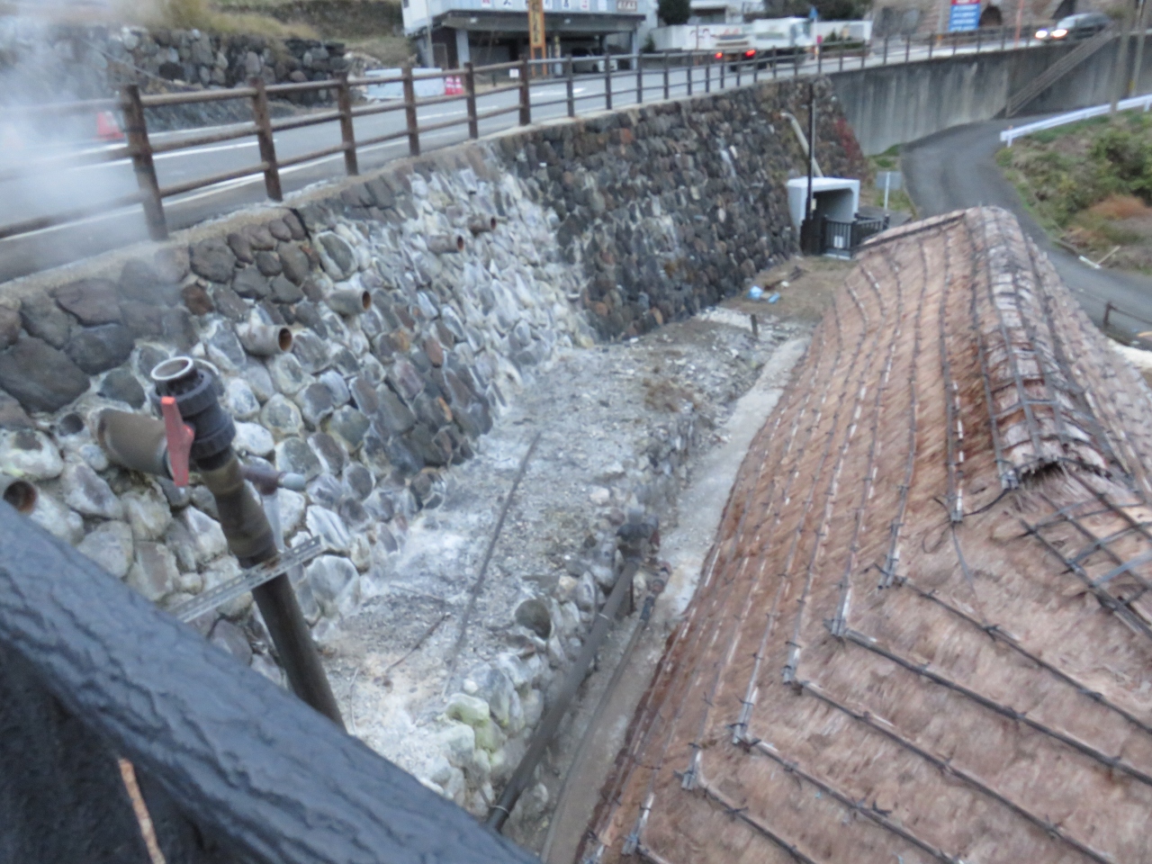 わらぶき屋根の「湯の花小屋」が建ちならび、