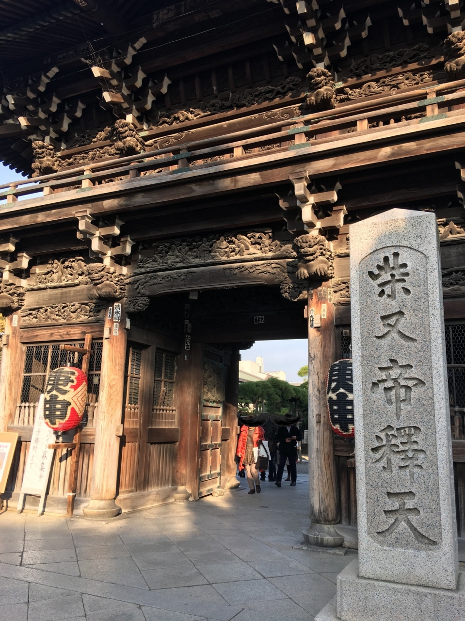 映画「男はつらいよ」の主人公、寅さんの生まれ育った街として登場する柴又にあるお寺で、もちろん映画にも何度も登場したお寺です。縁日が立つ庚申の日に参詣に訪れたところ、多くの観光客が集まっていました。機械製のおみくじの箱から映画のテーマ曲が流れており、映画さながら、昭和の香りがしました。