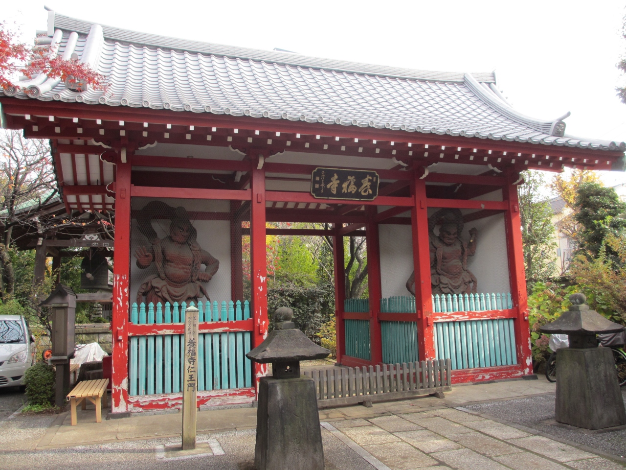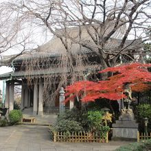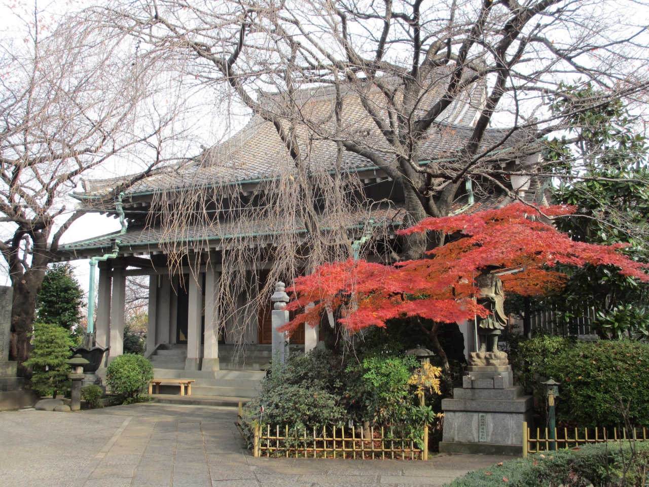日暮里駅北改札口から3分ほど、諏訪台通りに面して建つ真言宗の寺です。コンクリート製の門をくぐった先には、この寺の特徴の一つである赤く塗られた仁王門が建っています。寺の入口や境内には、もう一つの特徴である、江戸時代の文人の句碑や墓が残っています。本堂前には枝垂れ桜や松、もみじが植えられていて、訪れた時はもみじがきれいに紅葉していました。
