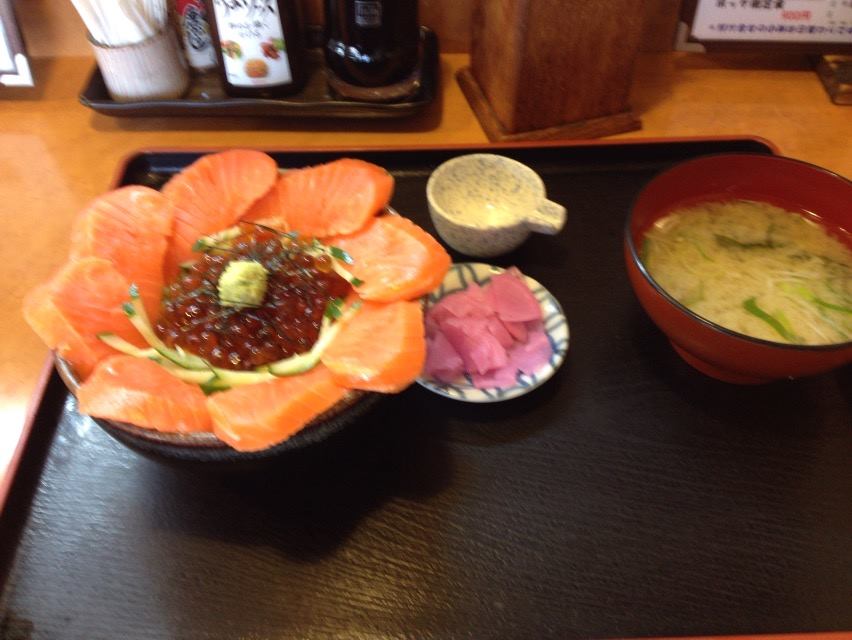 観光地向けな少しお高めなお店が多い中、しっかりと普通のメニューも安くであります、という地元の人が愛用するお店。逆手にとってこんな地元密着のお店の方に海鮮丼作ってもらったら美味しいだろうなと思って行ったら大当たり。ご夫婦でこじんまりと営業されており、旦那さんは職人気質でこちらが話さないと無口なかんじですが、いろいろメニューの話を関西人らしくずけずけ質問すると気を使って答えて下さいました。自分が頂いたのは親子丼(鮭の) ぜひ、写真を見て下さい。こんな丼、見たことありません。味もおいしい。堪能です。