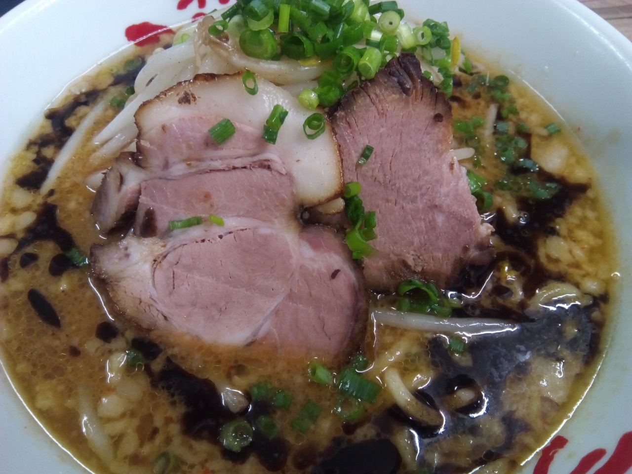 濃厚の味噌スープに、マー油が加わり深い味わい。チャーシューは厚切りで、スープと麺の強さに負けていません。