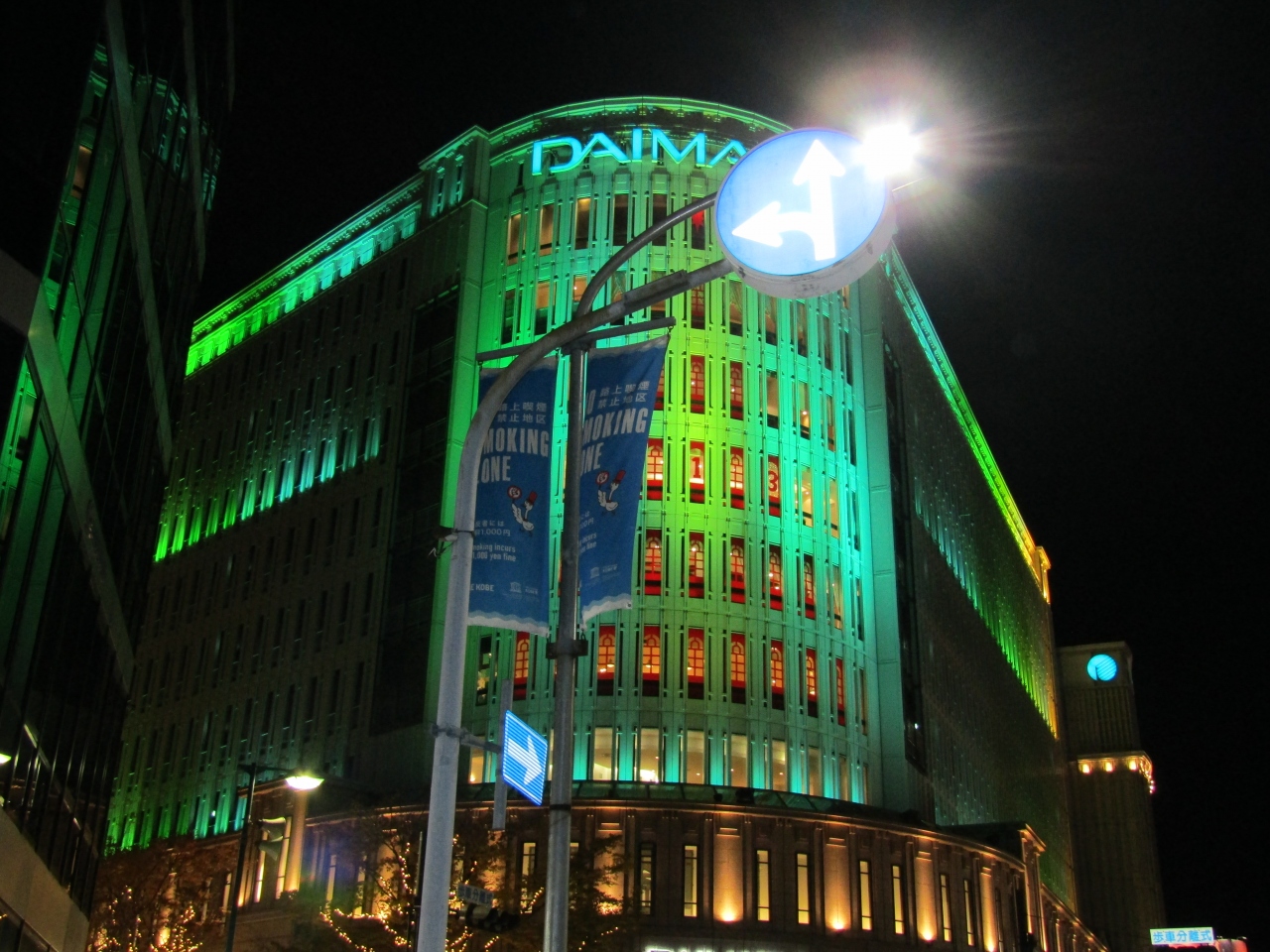 ルミナリエを見るために大丸あたりから歩き始めました。ぐる~っと歩いて日も暮れ、また大丸近くまで戻ってきた時、デパートがきれいにライトアップされているのを見ました。