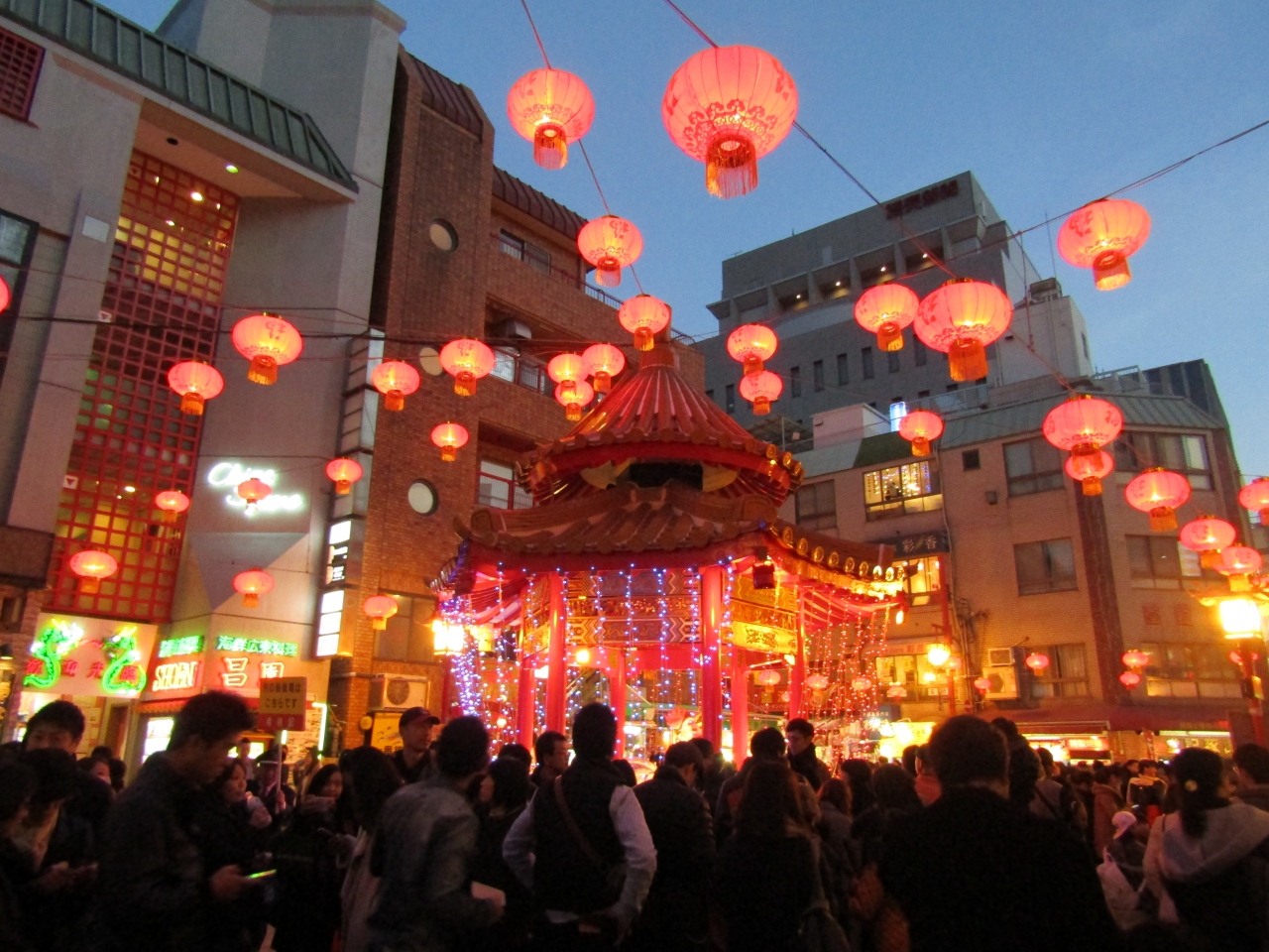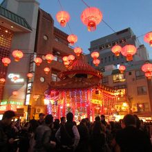 中華街らしい広場です。屋根のある東屋や記念撮影にぴったりの人形などいます。そして今はランタンがたくさん飾られていて、点灯するととてもきれいです。