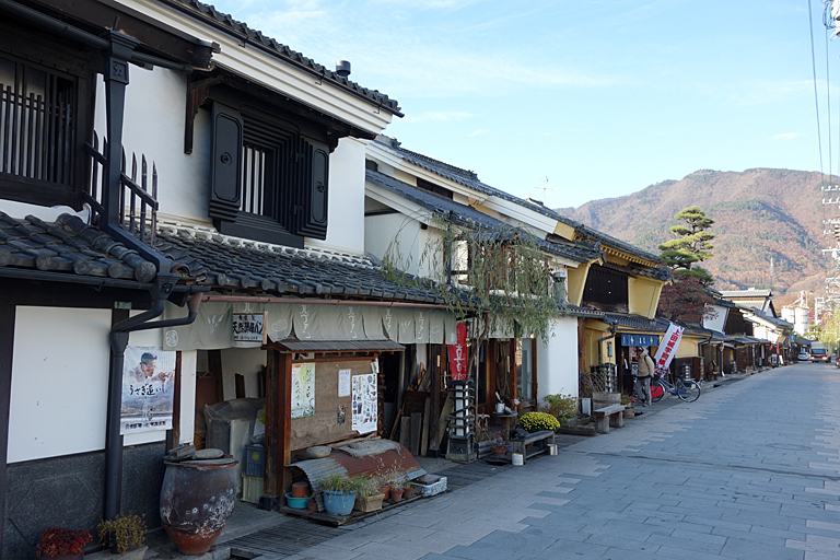 旧北国街道沿いに、小さなエリアながら昔の町並みが残っています。格子戸のある家の多くは飲食店や造り酒屋として使われています。ここはそれぞれ家の色や造りが違うので、奈良井宿や妻籠と比べてもカラフルに楽しく感じます。なのに統一感はちゃんとあるのが不思議?