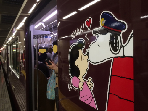 期間限定で阪急電車にスヌーピーがディスプレイされていました。