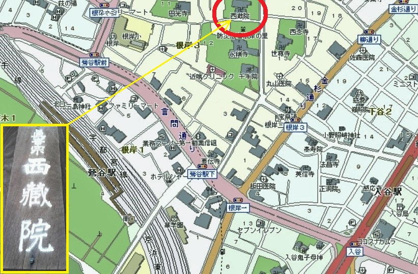 真言宗智山派寺院の西蔵院は、圓明山宝福寺と号します。天正19年(1591)の書類に記載があることから江戸幕府開府以前の創建と考えられます。江戸時代、当地周辺は時雨岡と呼ばれ、当寺にあった不動堂は時雨岡不動堂と称されていた他、根岸の三木といわれた御行の松が著名であったといいます。荒川辺八十八ヶ所霊場2番札所です。
