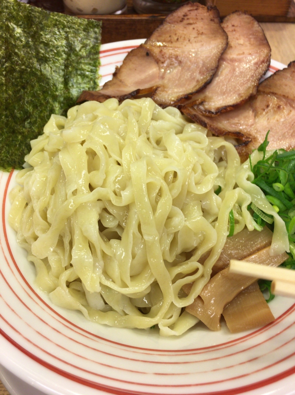 前回なにを食べたのか忘れましたが、つけ麺の大盛り(チャーシューがないようなので追加)を注文しました。混んでいたためか結構時間は掛かりました。