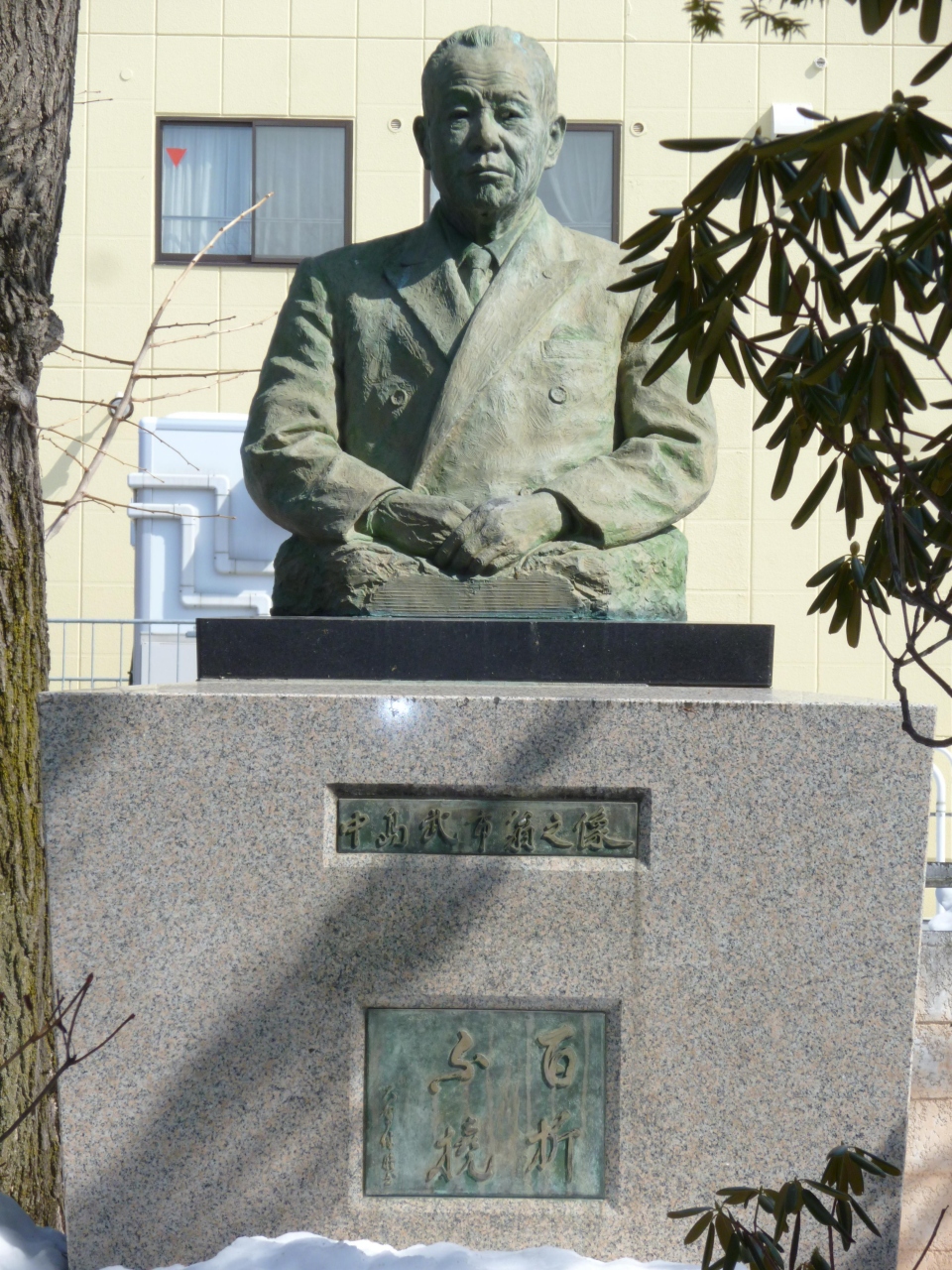 敷地中央には大きな本堂が有りますがその脇の植え込みの奥にあの中島武市氏の銅像有ります。冬場は雪に埋もれてて見学が大変でした。
