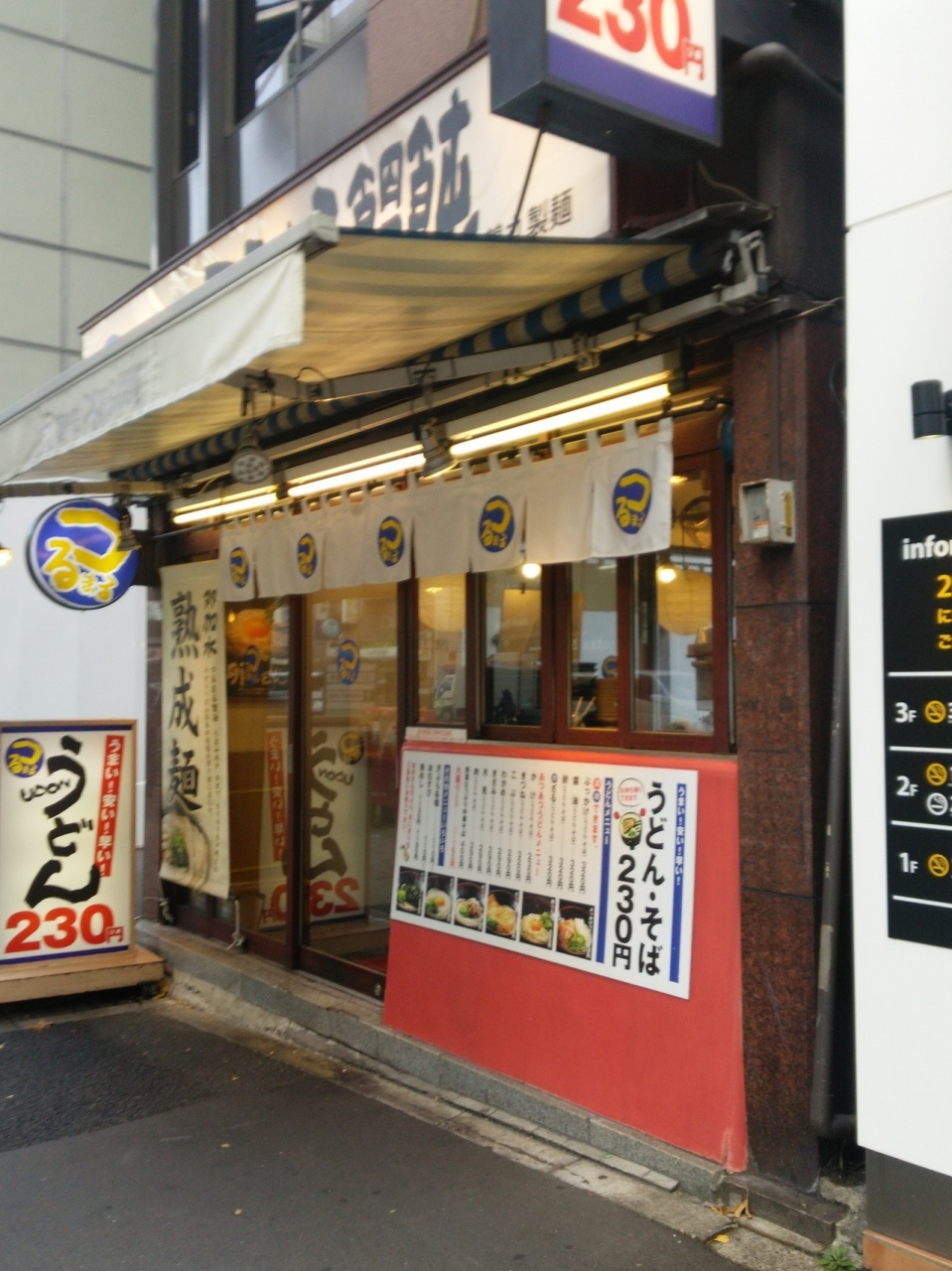 新橋駅(銀座口)から徒歩数分、外堀通り沿いにあるうどん屋です。店頭にある「うどん230円」の看板が目をひきます。かけうどん(かけそば)が230円と低価格で食べることができるので安く速く食事を済ませたいときはちょうど良いお店です。