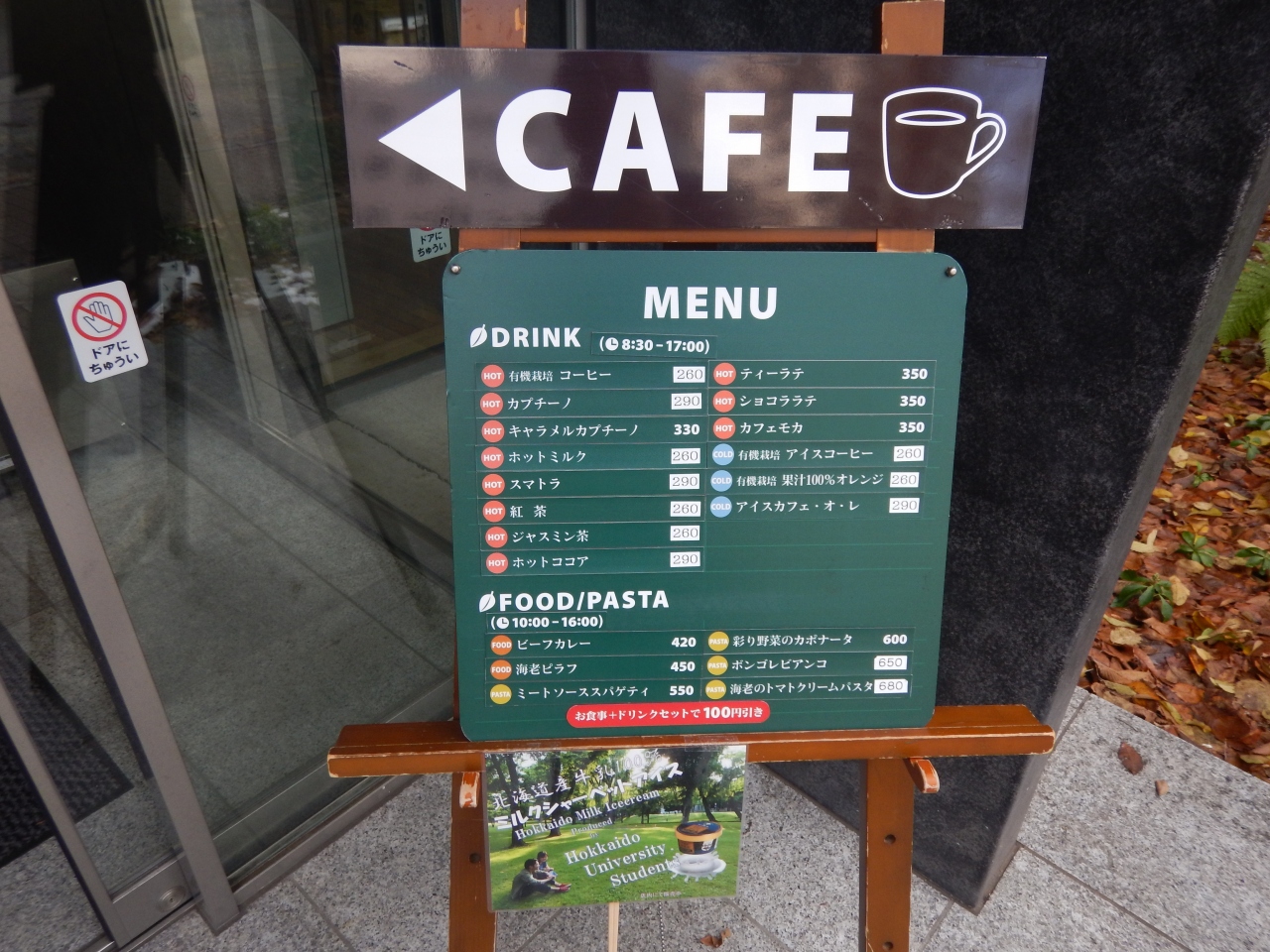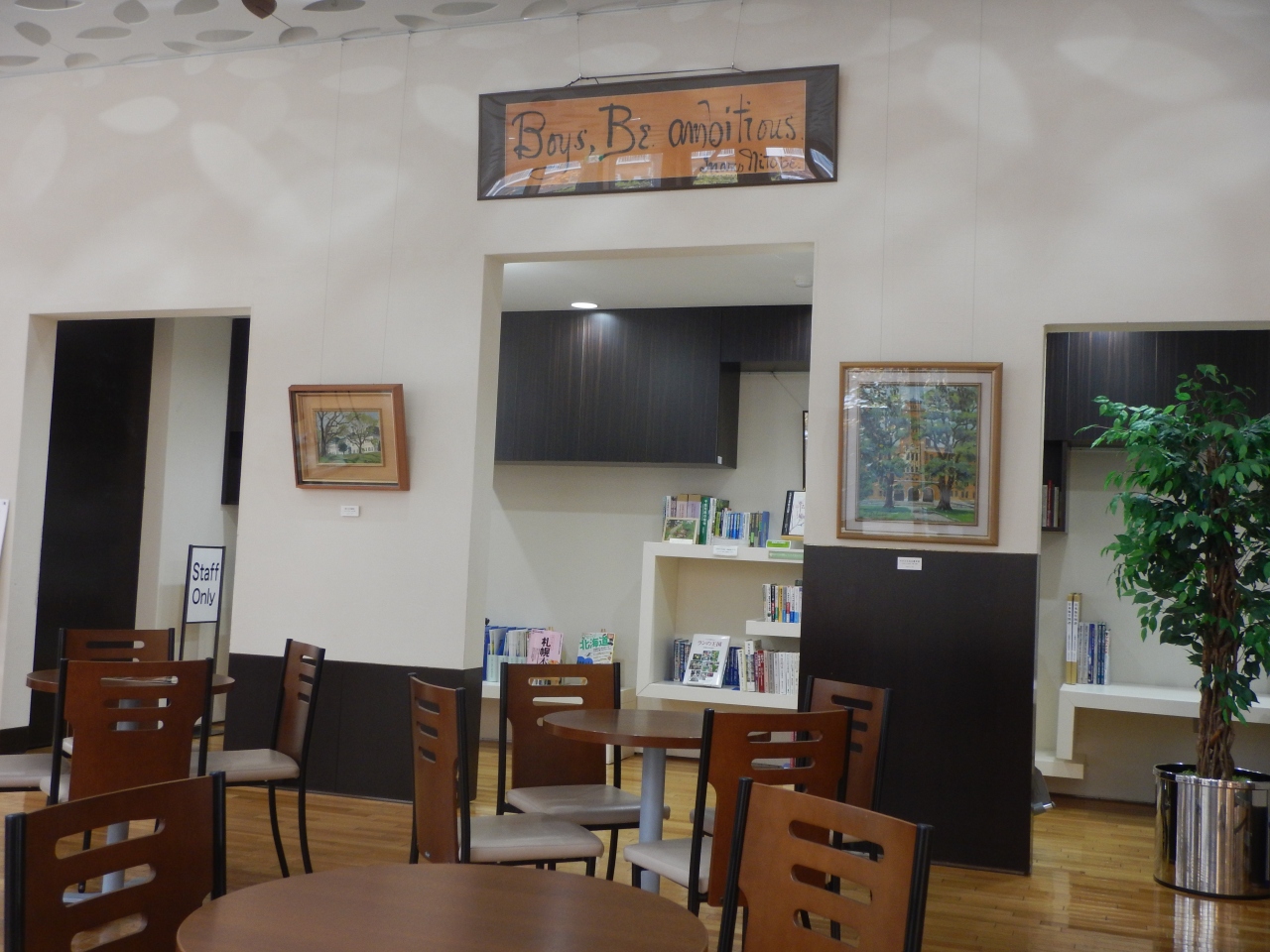 ここは何度か来たことがあるが、いつも「キャンパスガイドマップ」もらい、ショップを覗いてみるだけだったが、初めてコーヒーを飲んでみた。260円と安いが、味は悪くなかった。壁には新渡戸稲造が書いた「Boys be ambitiaus」の額がかかっていた。