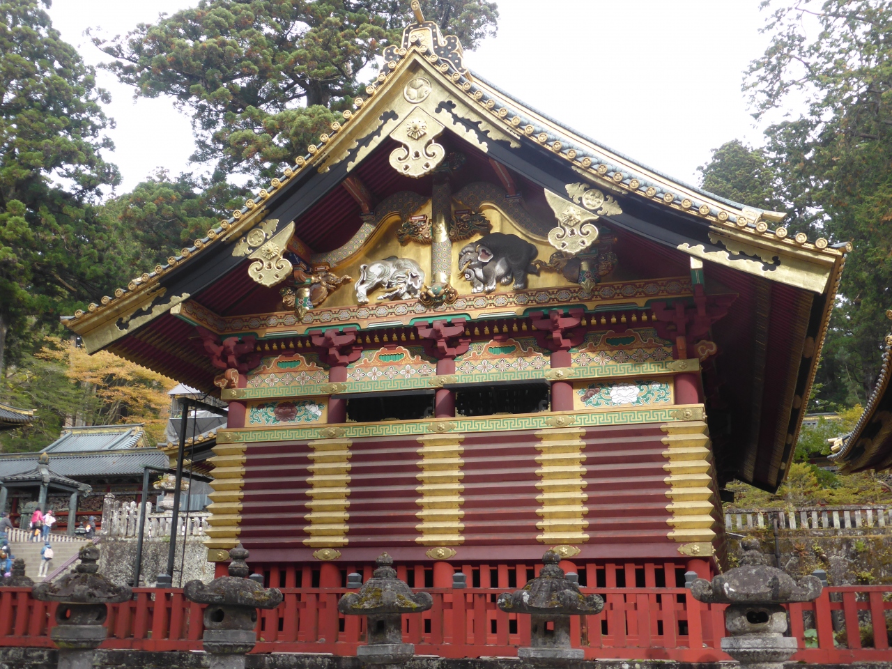 表門を入って、すぐ目の前にある三棟の建物です。手前から下神庫、中神庫、上神庫で3つ合わせて三神庫と呼よびます。三神庫には千人武者行列など東照宮のお祭りに使う道具が収められています。一番の見どころは上神庫にある「想像の象」。現在修復中のカバーが掛けられている所が多い東照宮ですが、極彩色の建物を見る事ができ一番の東照宮らしい写真を撮る事ができます。