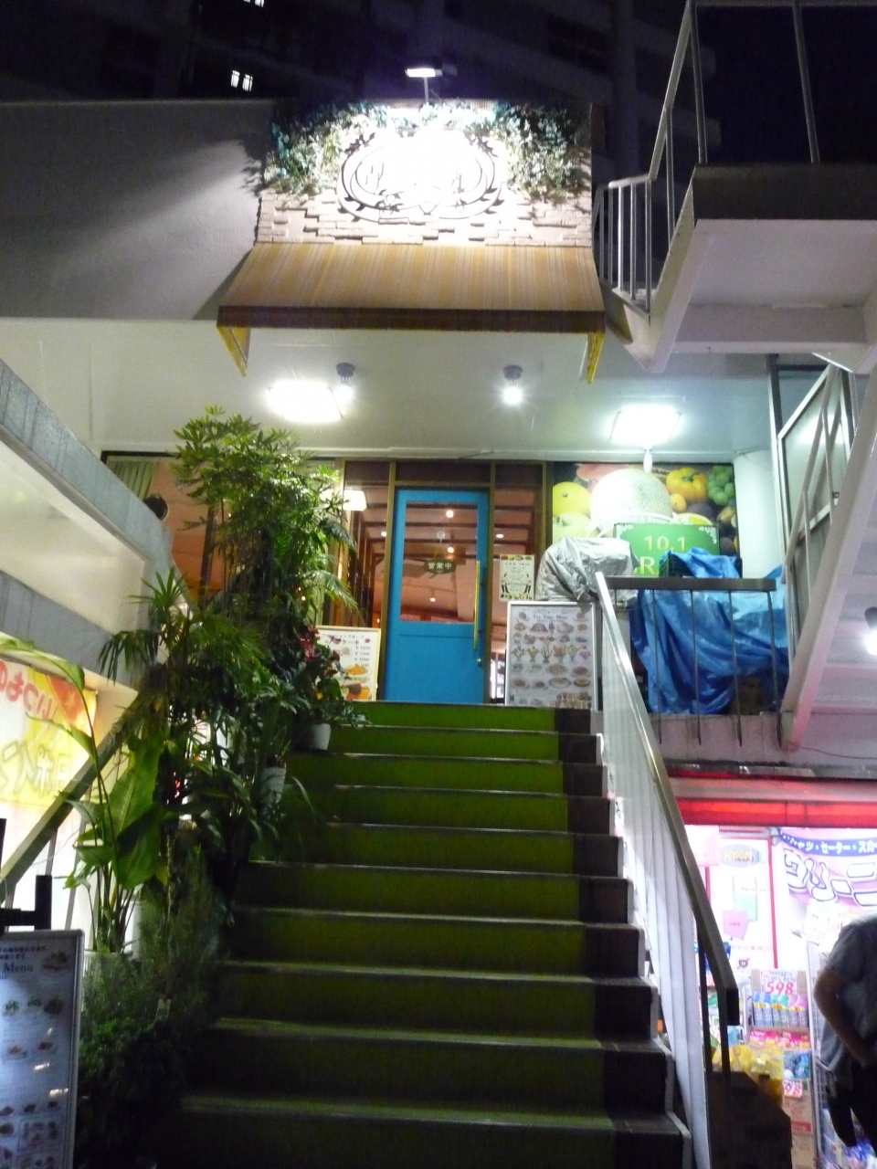 1階はドラッグストアで、正面にある2階への黄緑色の階段が目印です。