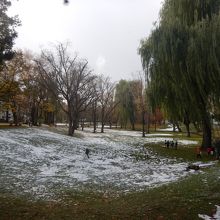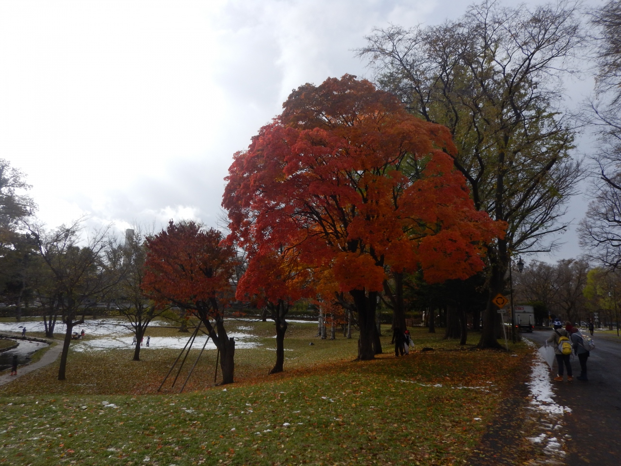 数日前の雪がまだ残っていた。大野池周辺には楓に木はは少ないが何本かあり、紅葉していてきれいだった。落ち葉を1枚土産に持って帰ってきた。