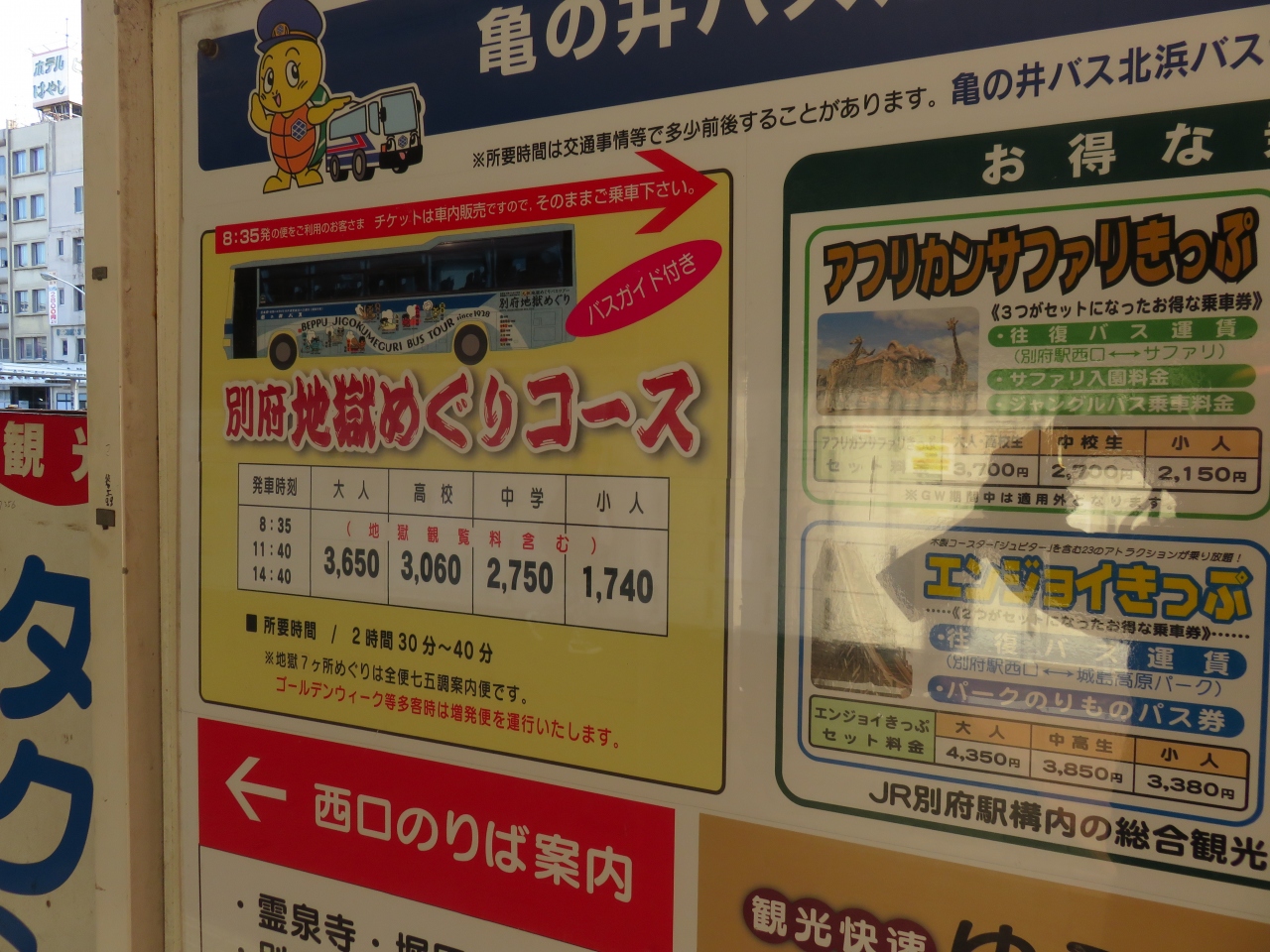 別府の地獄めぐりをスムースにしようと思えばこの観光バスでしょう。海、鬼石坊主、かまど、鬼山、白池、龍巻、血の池の七つの地獄を巡ります。
