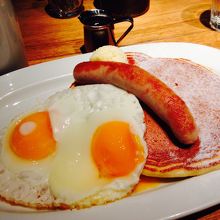 クラシックバターミルクパンケーキにソーセージと目玉焼きがついたのと紅茶を注文。