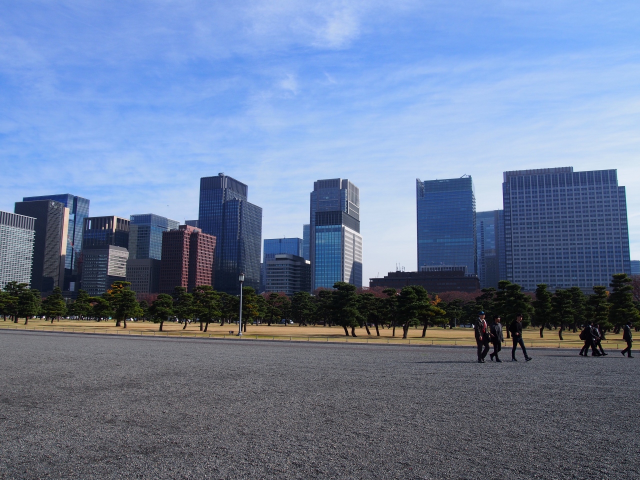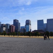 皇居前の皇居外苑の広場です。広場は人が歩ける場所と木々や芝生がある緑地の場所に分かれています。人が歩く場所は砂利道で少し歩きにくいです。皇居広場は広いのでけっこう歩く距離があります。正門橋、二重橋付近には観光客が多く集まっていますが、そのほかの場所はあまり人がいませんでした。