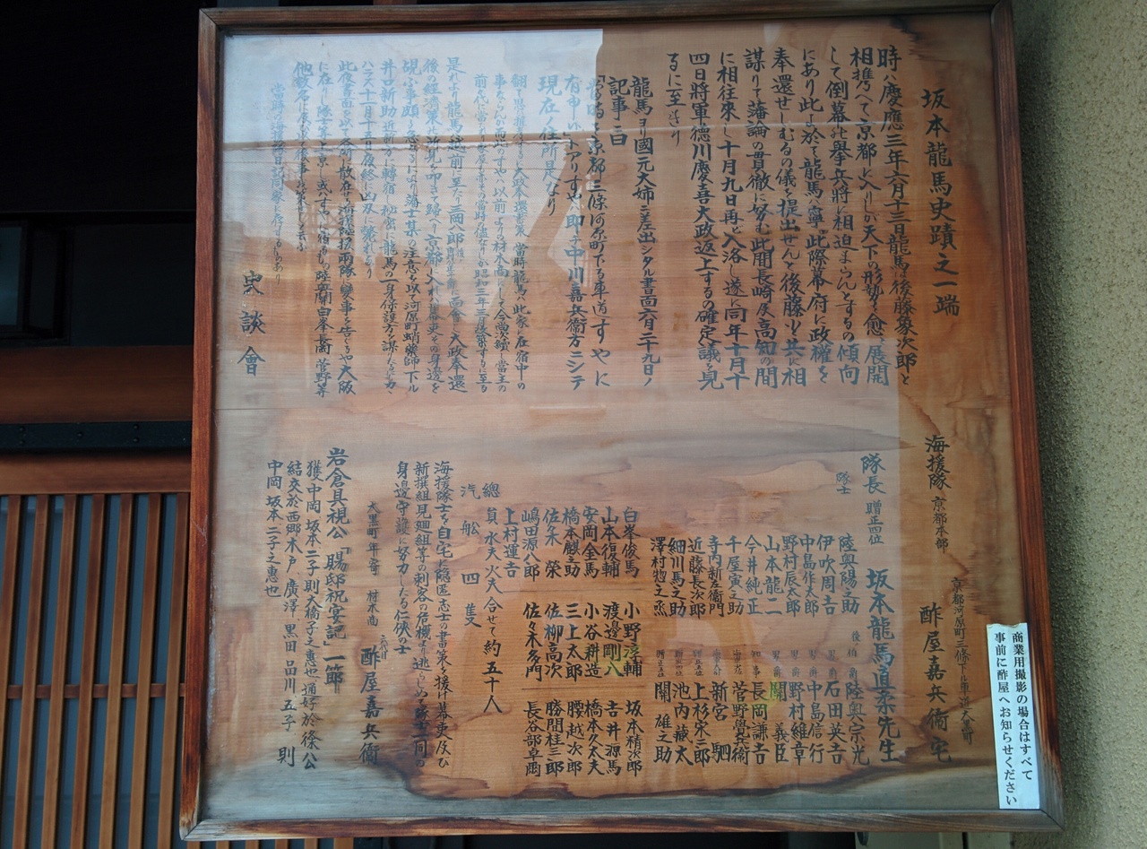 幕末の頃、「酢屋」は三条河原町下がった場所にある現在の場所で材木商を営んでおり、坂本龍馬と海援隊士を匿っていたことで京都では有名な場所となっています。