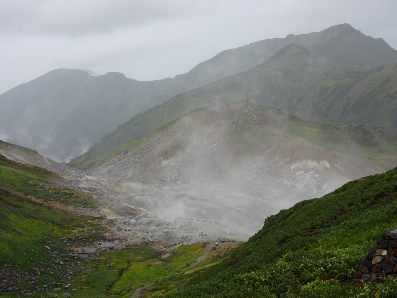 室堂ターミナルから歩いて10分ほど、「みくりが池」が見えてきたところで、反対側に湯気が見えてきます。かつては近くまで行けたようですが、安全面を考慮し現在は立ち入り禁止になっています。でも、もくもくと湯気が上がる景色は見応えがありました。