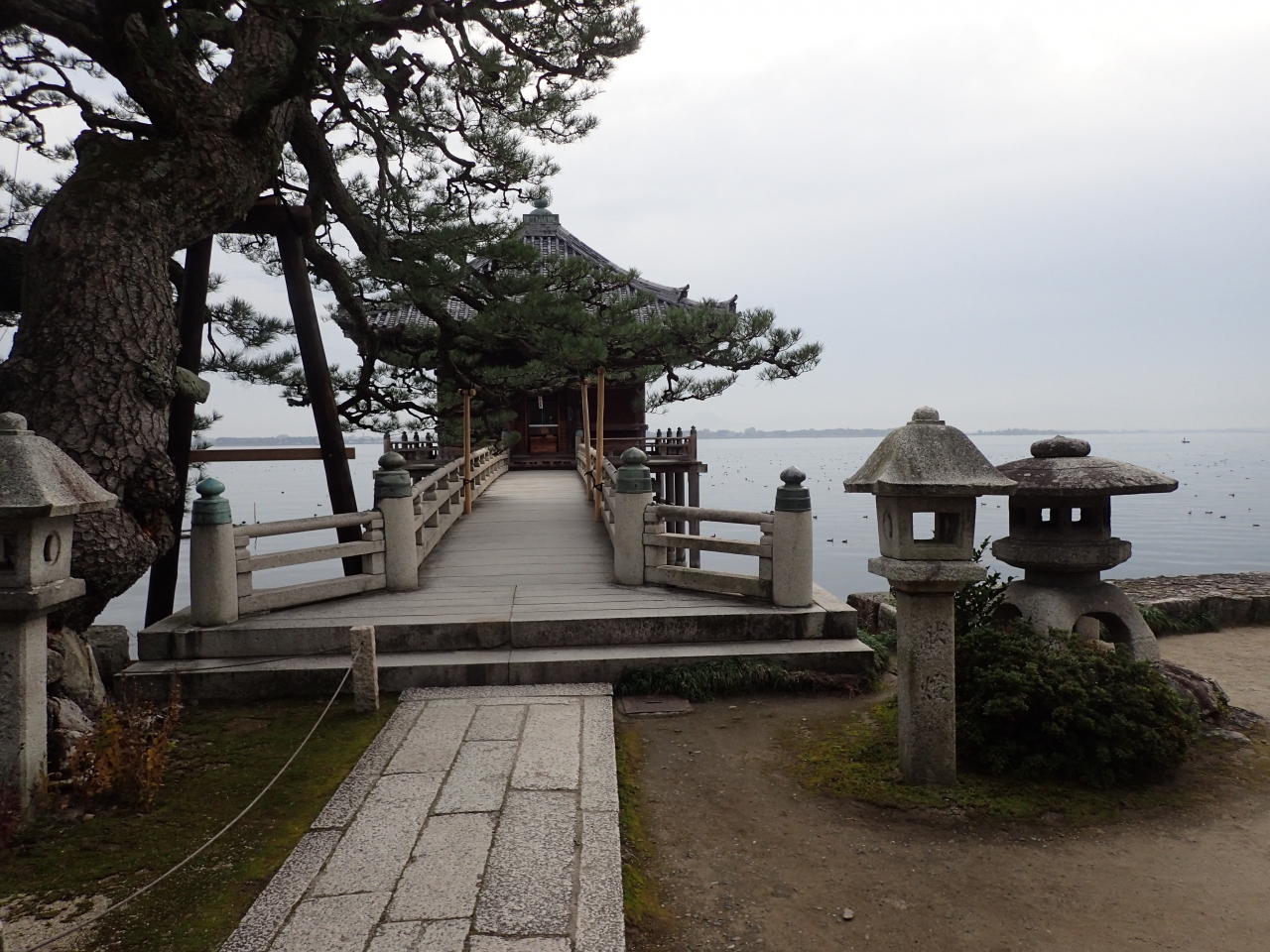 湖上に浮かぶお堂は結構珍しいと思います。波の音を聞きながら、お寺内部を散策すると、素晴らしい枝ぶりの大きな松や綺麗に掃き清められた庭に見とれながら、心地良い、落ち着いた時間が持てました。松尾芭蕉が詠んだ場所でもあります。