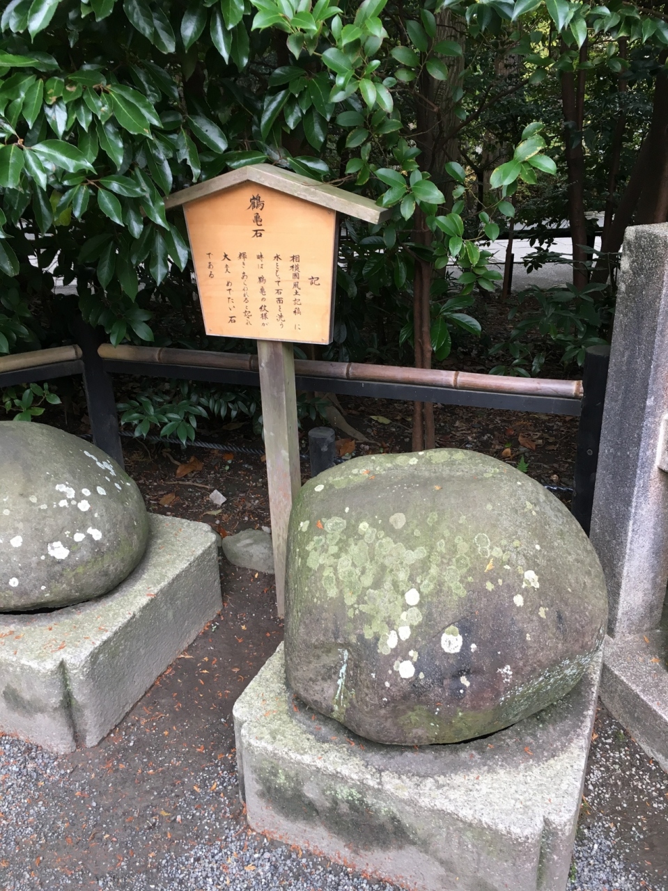 鎌倉を観光に訪れた際に、鶴岡八幡宮を参拝し白旗神社に向かって歩いていると、何やら二つの石があり近くに行ってみると鶴亀石と書いてありました。水に濡らすと鶴と亀が浮かび上がるとの説明がありました。直径30センチほどの石です。