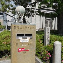 「中之島」にある「日本銀行 大阪支店」の前に、金色のレトロなポストが建っており、その横に「駅逓司大阪郵便役所跡」の石碑が建っていました。